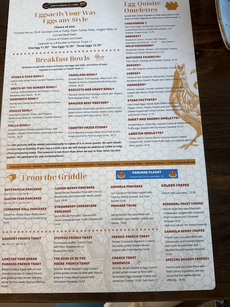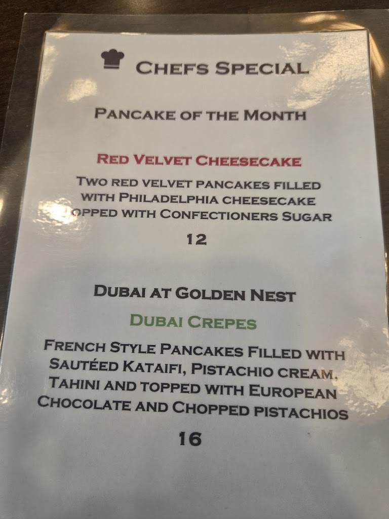 We had a phenomenal experience at Golden Nest Pancake and Cafe. We waited for roughly 15 minutes on an incredibly busy Sunday morning which I thought was more than appropriate for a peak time. The portion sizes were well worth the cost of each dish. I have never looked at a menu where I wanted to try every single thing before looking at their menu: fresh juices, coffee drinks, scrambles, pancakes, etc. I am gluten free and still had plenty of choices to choose from; however, I am not sure of the cross contamination, so remain vigilant when ordering.