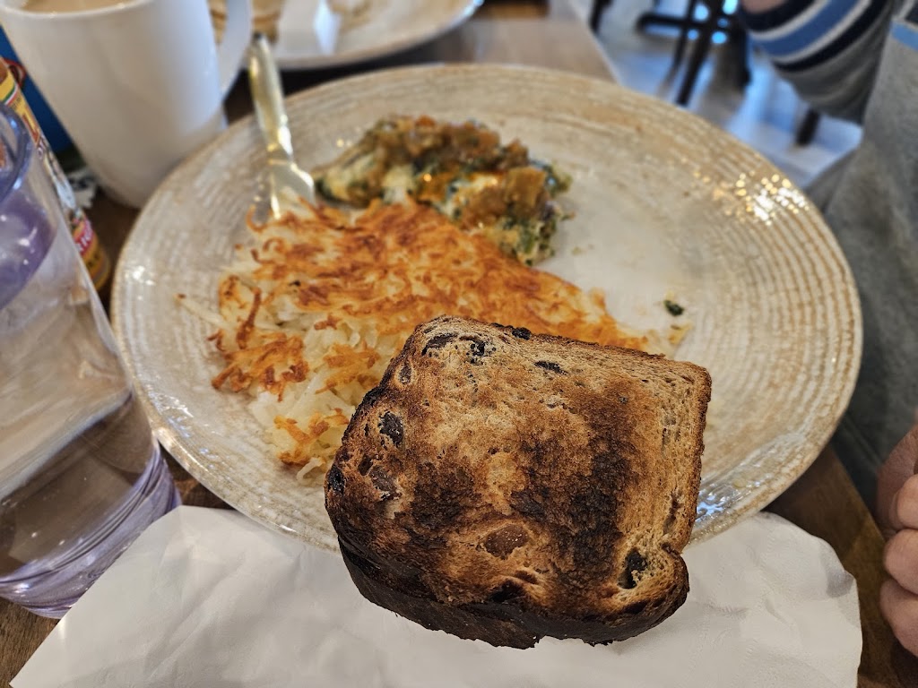 A year ago we stopped in based on the ratings. I ordered soft scrambled eggs, hash browns that are not crispy, and lightly toasted wheat bread. And bacon, of course. I was served hard scrambled eggs, crispy hash browns, and hard toasted bread. And very thin bacon.