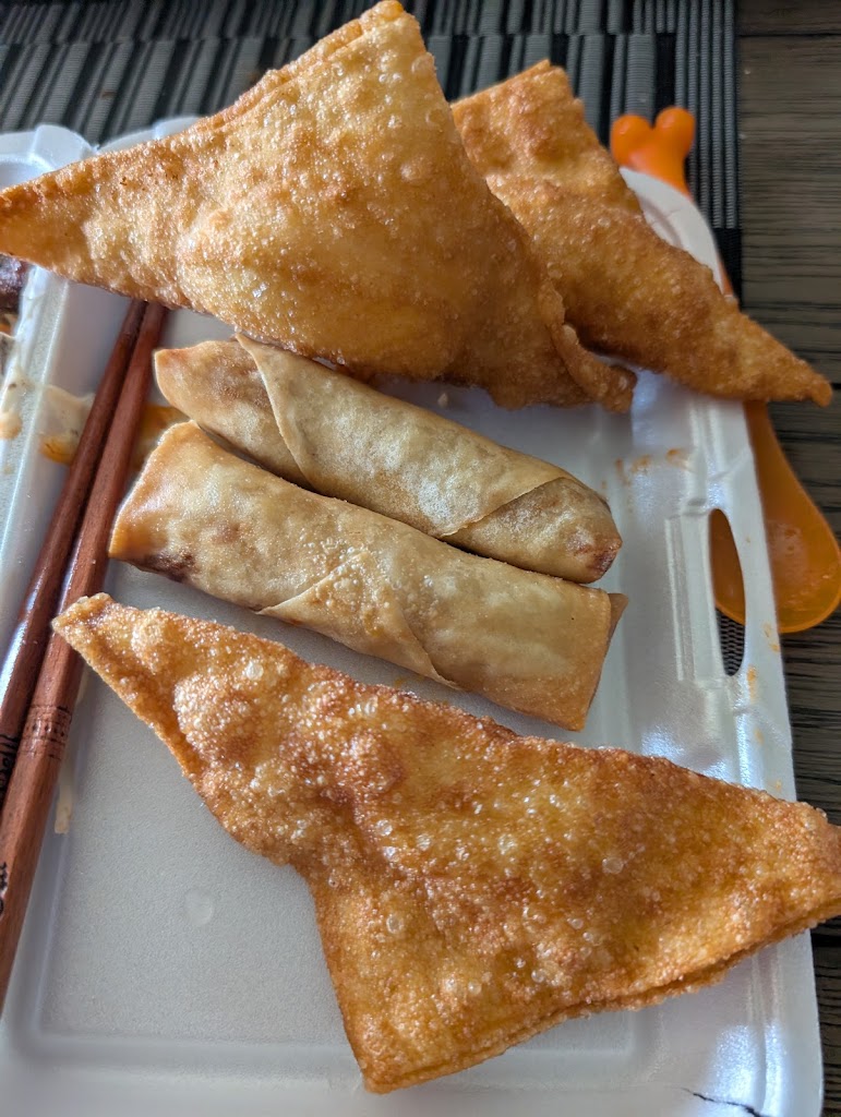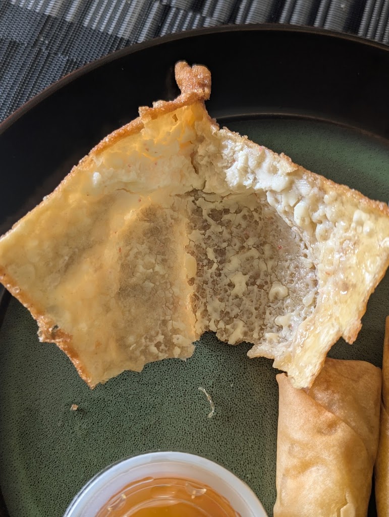 I felt the rangoons were fried nicely and the filling was a good cream cheese to crab meat ratio. They didn't try to mask a lack of crab with an abundance of onion like other places, so that was nice. That said, the filling was pretty non-existent and the majority of the rangoons were just wonton and airy cavity (see pic). For 3 rangoons for $2 I would rather see 2 for $2 and get a more fulfilling rangoon.