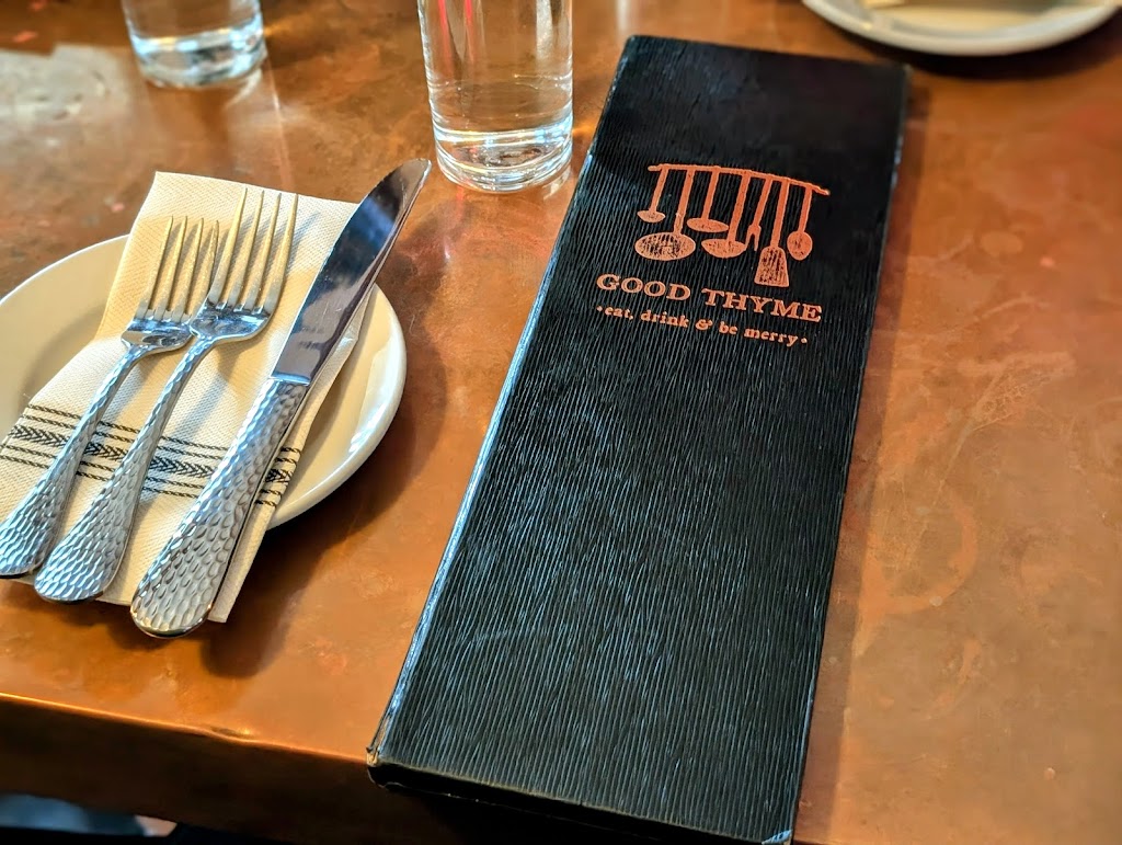 Good Thyme is a cozy, beautifully decorated place with delicious food and excellent service. We had the Friday night fish, and it was done perfectly and came out super fast. The couple next to us had a baby that mom had to take care of for a bit, and when they asked if the restaurant could keep their plate warm the staff was super understanding and accommodating. I would recommend a reservation, luckily there were two spots at the bar but this place is popular for a reason!!