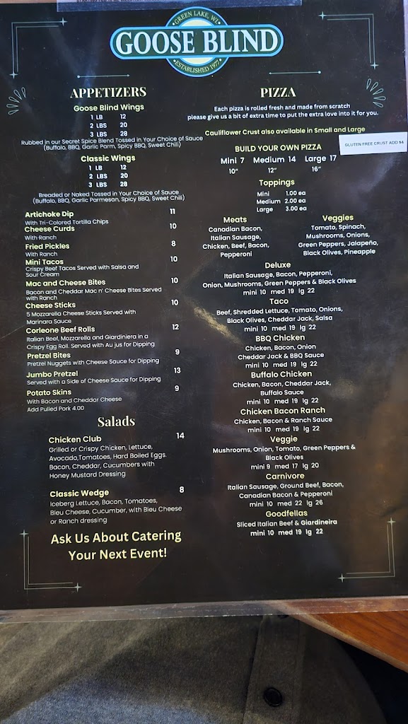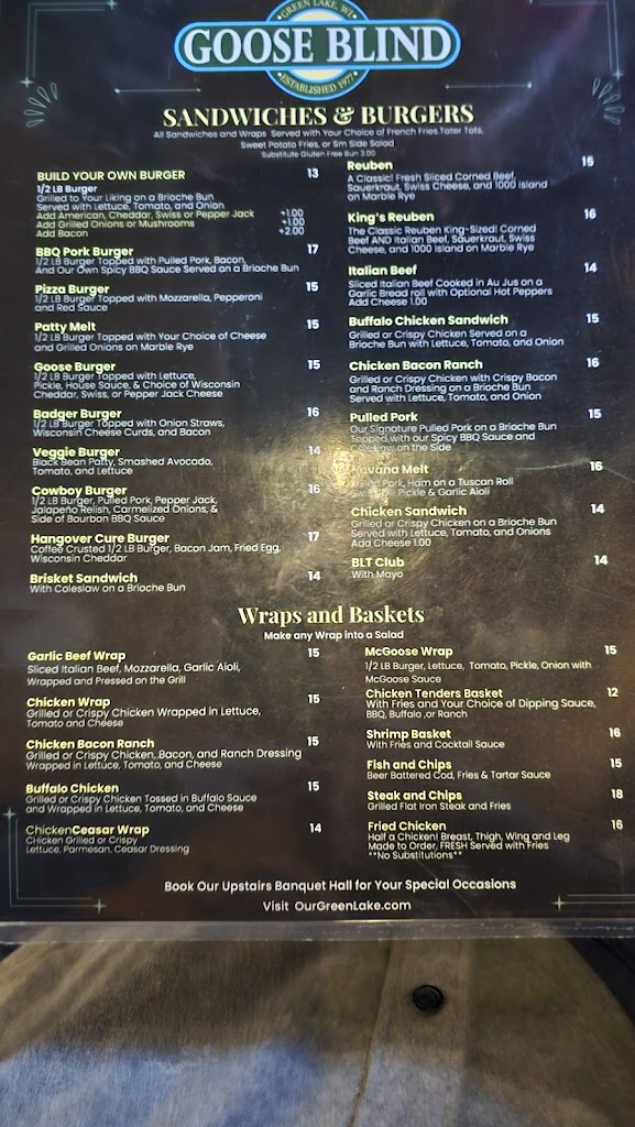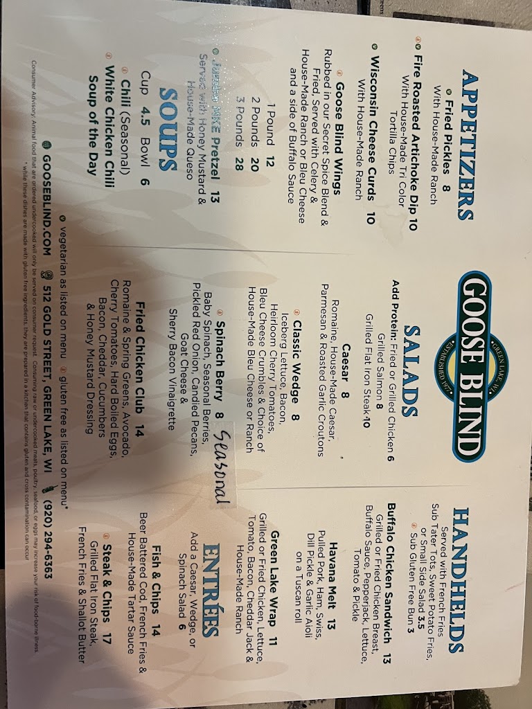 The Goose Blind G&B is our go to place after golf when visiting the Green Lake area. The atmosphere is casual, bar staff are friendly and attentive, and the food is reasonably priced and delicious.