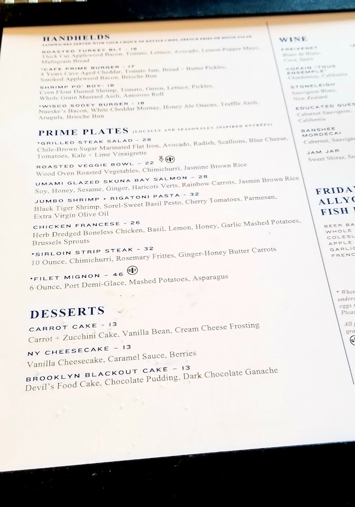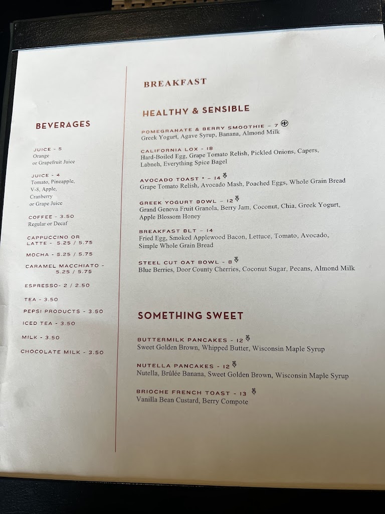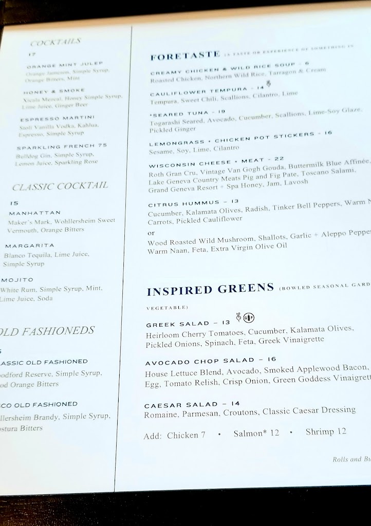 Sadly GC has lost service etiquete not something expected on Grand Geneva Resort excellence. I got my bill right in the middle of my burger. No dessert, not coffee offering. However food was good quality .