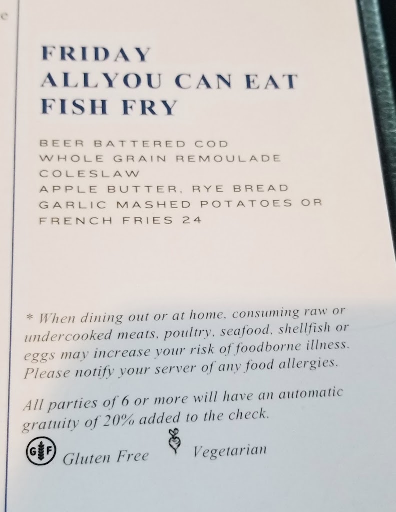 We were guests at the hotel for my birthday. Went out for a fish fry on Friday. My food come out cold and they forgot my wife's order so I had to eat cold food while I waited for my wife's to come out. Was the worst fish fry I have ever had. The fish looked like boxed fish from Walmart and tasted horrible. The potato pancakes were over cooked and dry. The Cole slaw was almost unedible. I say almost cause I spent 28 a plate so needed to eat it. Would not recommend it.
