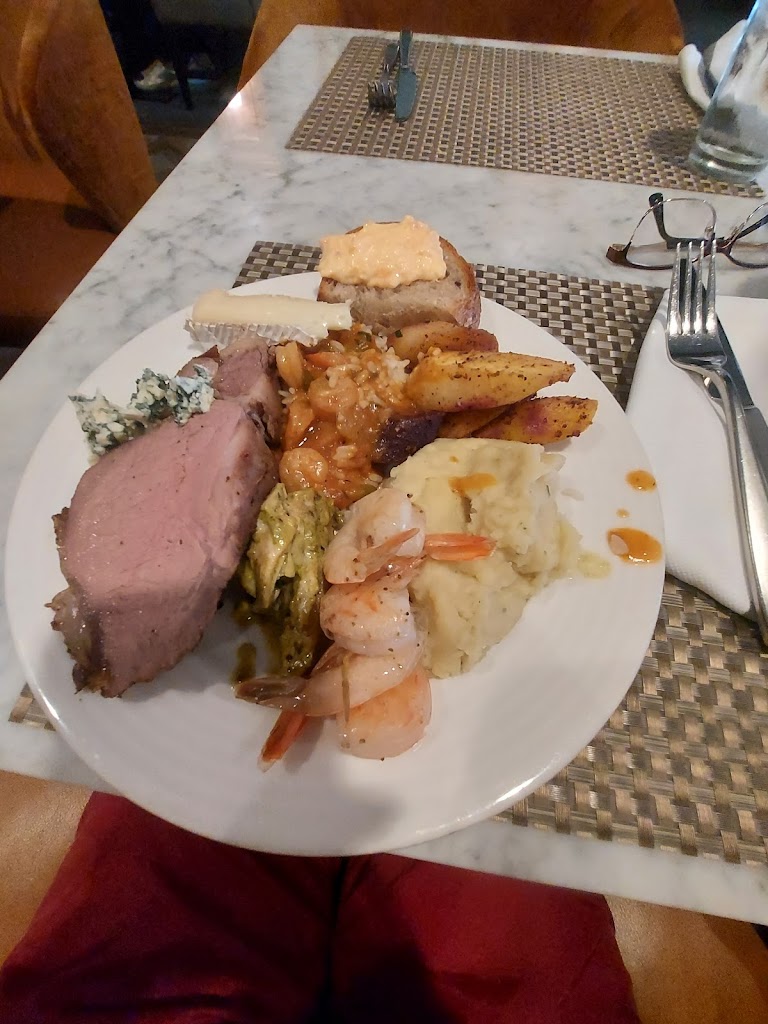 A memorable Christmas dinner was had at the Cafe by my wife and I. The dining room was large and well spaced for the Covid situation. Our waiter, Chandler, was very personable and articulate. The whole staff seemed well trained in serving what seemed like sophisticated diners. Our before-dinner cocktails were well mixed and prompt. We both had the special entree of the evening, which was prime rib. The only glitch in the evening was that we had asked the waiter to wait a little while before placing our order to give us time to enjoy our drinks. The dinners were delivered at room temperature and had to be redone and came out delicious. The manager comped our drinks with a sincere apology and all was well. This is a sign of a well managed, first class establishment. The hotel was decorated for the holidays which added to the experience. We will certainly return in the future.