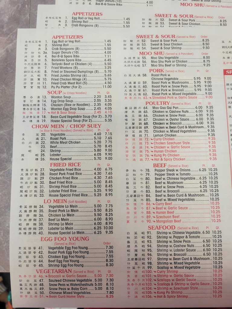 I had crab ragoons and Seafood Delight (Special? Forgot what it was called). Seafood dish was tasteless(except for the BIG shrimp) Put hot sauce and sweet/sour on it to give some flavor. Ragoons were worst i have ever had. Staff very friendly. Service was excellent but food was not! Kinda pricey-$25