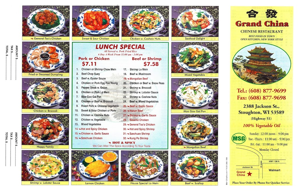 When I'm in the mood for a little Chinese I choose Grand China Restaurant. They always have my call in order ready when I arrive and always very friendly.
