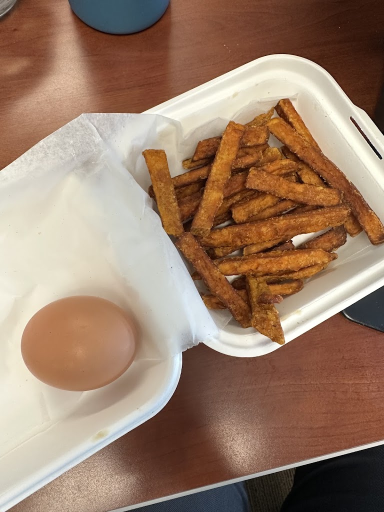 Beware, this is what they consider a “basket of sweet potato fries”. Egg for size reference This was small to go container with a few fries all for $5.99 plus tax and tip.