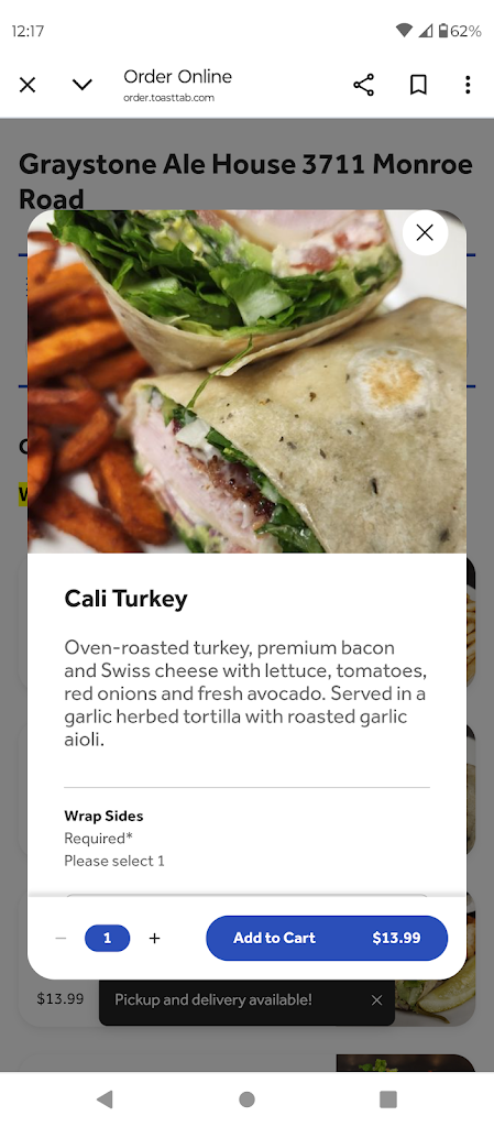 I placed an order for 2 Cranberry Pecan Salads. The description stated that it would have grilled chicken, of which neither had grilled chicken. We also ordered a side off brussel sprouts and spinach dip. I ordered for pickup at 5:15. I did make it there a few minutes early (5-7 minutes early) and the food was packed and ready to go. The young lady was very nice. I live a minute away from Greystone. When I got home, the lettuce was very wilted, missing chic and the sprouts and dip were lukewarm at best. The place was not busy at all. We’ve been there several times and also ordered to go a few times. This experience was very disappointing to say the least.