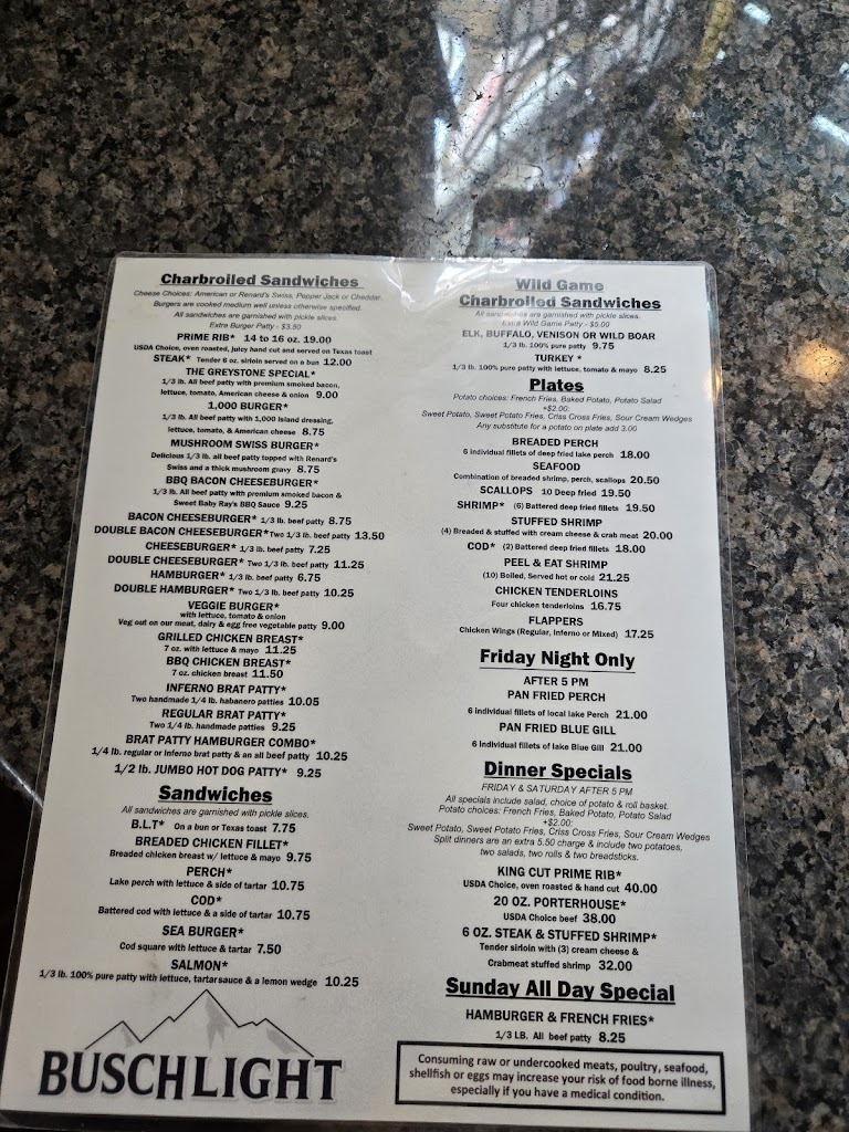 Get the prime rib sandwich medium rare you don’t be disappointed. Been coming to the Greystone since 1992 never had a bad meal.