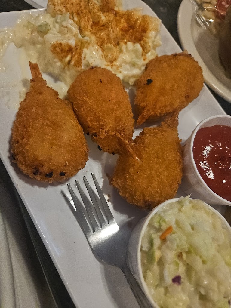 Everything was great. Breaded perch any day of the week, stuffed shrimp with crab and cream cheese were so good, I didn’t expect them to be that good! They even served corn fritters with our orders which were delicious and unexpected!