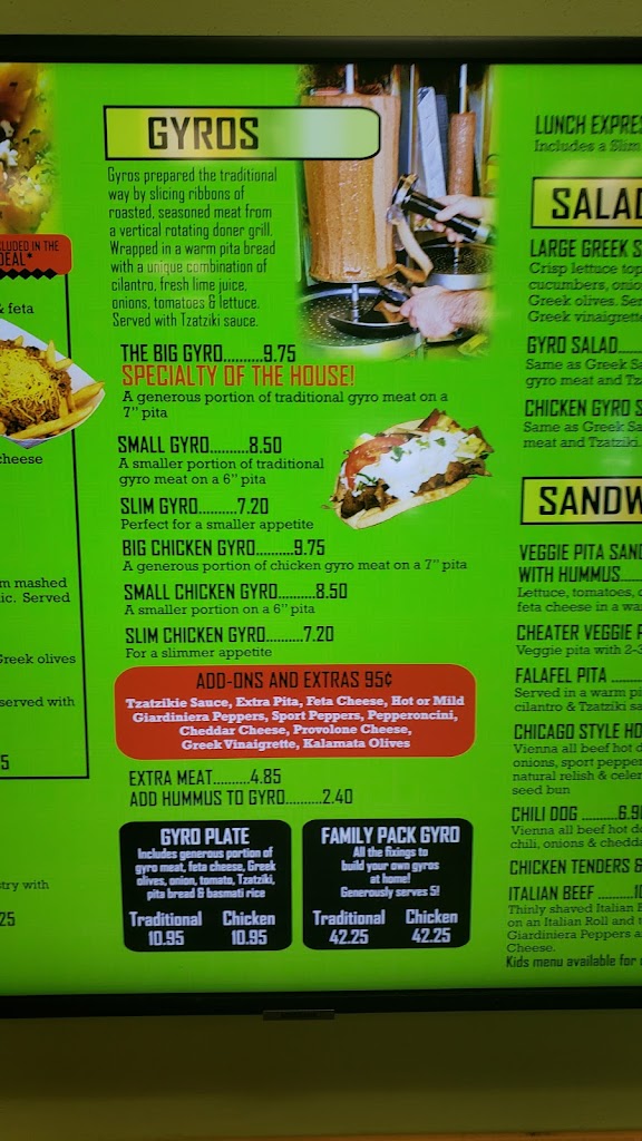 Huge portions and great tasting food. Gyros, chili cheese fries, salads. Only wish they were open later during week and especially Saturdays