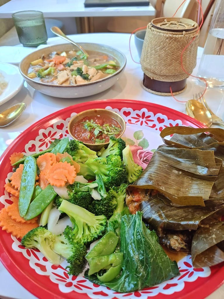 Mok Pa (cod cooked with kefir lime and coconut, I believe), in a steamed banana leaf, with sticky rice, was beautiful and very tasty. Husband's chicken cashew sauce was also excellent. Pleased to have a water jug on the table. Appetizer dishes were slow to be removed, and waiter seemed very apathetic (but did his job just fine), but otherwise the experience was great and we will return. I hope some art gets put up on the walls. Was a bit sterile looking!