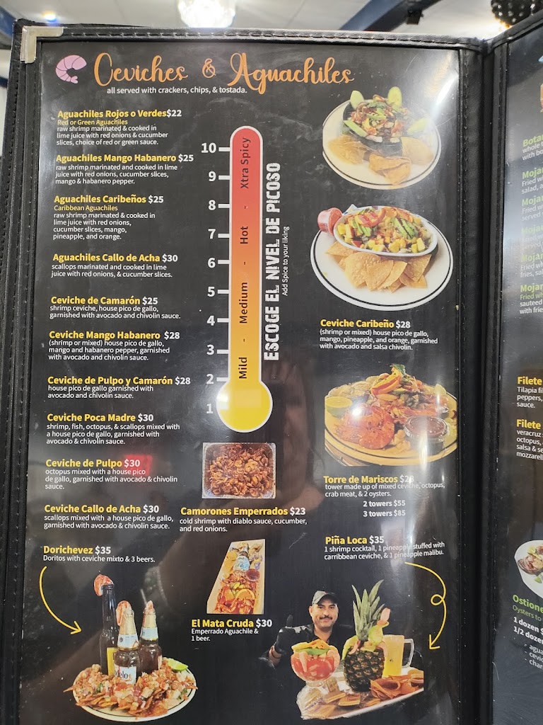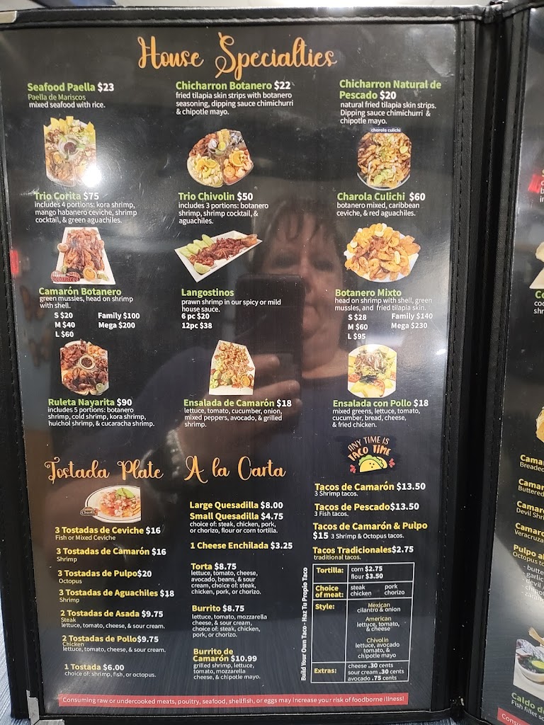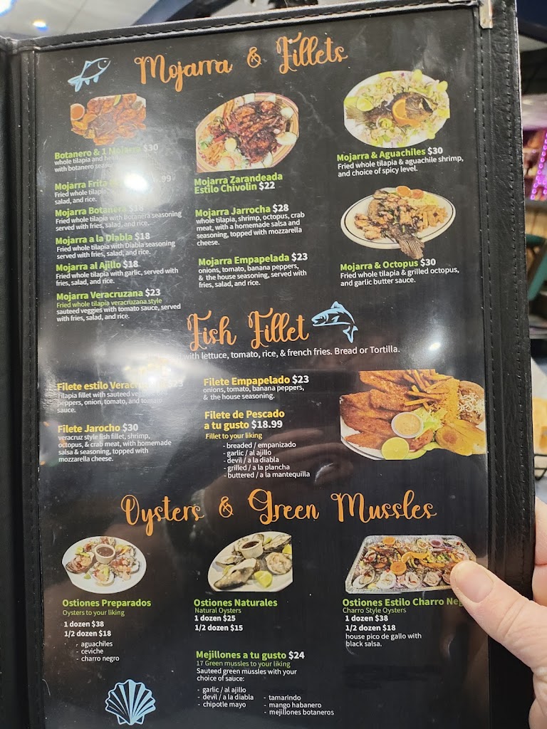 Nice cozy place ,enjoyable live music ,slot machines,very clean , specializes in seafood but it has a variety of other dishes,the food I ordered was average ,since camarones botaneros is the signature I’ve tried the caldo 7 mares ,good dish ,the only issue was the hand made tortillas,need improve on the recipe or the ingredients after Just 3 minutes the tortillas was hard ,and prices was ok no cheap but not too expensive..
