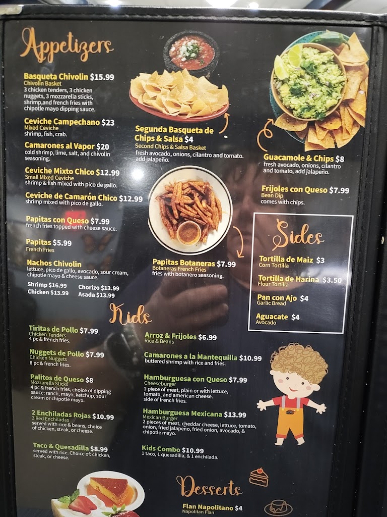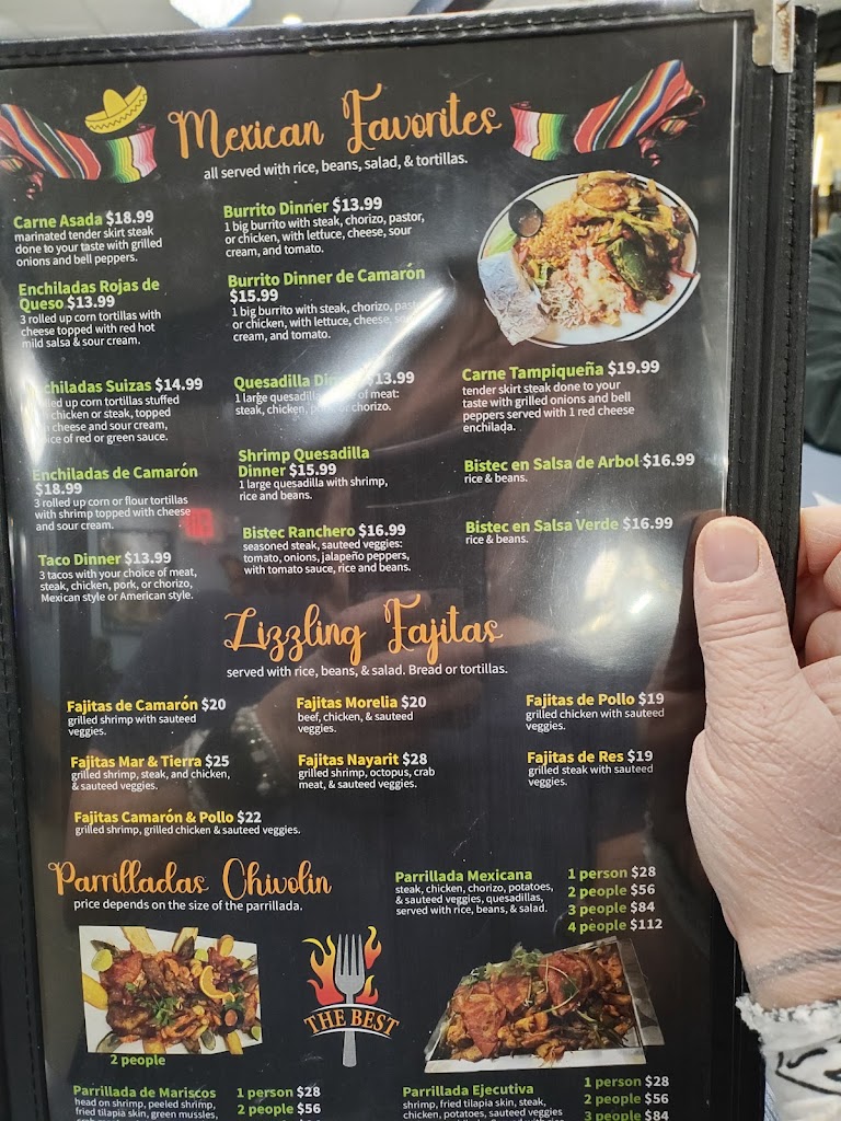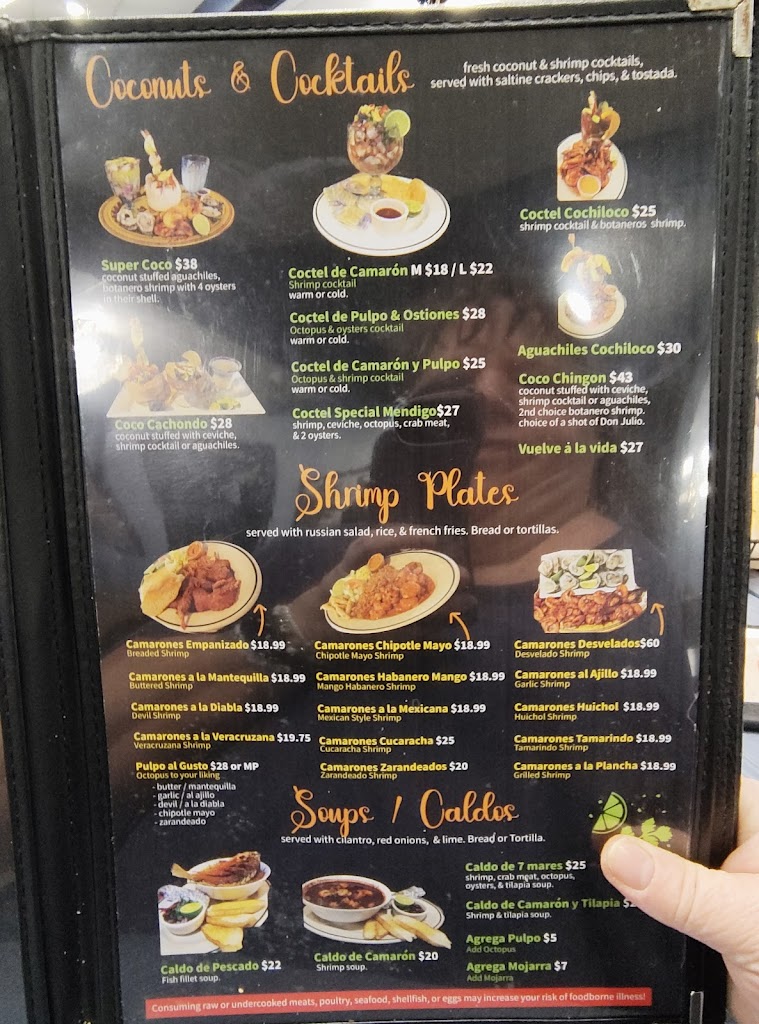 Menu: The menu is over the top. An absolutely ridiciulous amount of choices; several of which are just stupidly expensive. Many of the menu items don't have a detailed description of what the item is, exactly, for example half of the shrimp dishes. No clue. Overall for a mexican restaurant, the entire menu is in my opinion a bit pricy. (including that any extra chips/salsa incurs a $4 charge... seriously?)