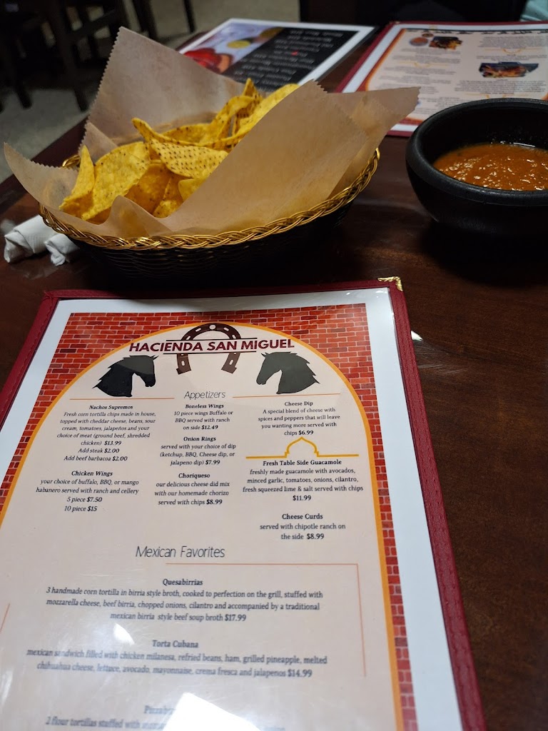 We had a wonderful time at the Hacienda San Miguel. The moment we walked in the door we were welcomed. Our waiter made certain that we were seated in a comfortable spot that met our needs. He was solicitors throughout. The food was excellent and very Authentic. The only minor quibble was that the music was loud, but the waiter turned it down upon request. The ice cream parlor next-door was also Fantastic. Would recommend without reservations.