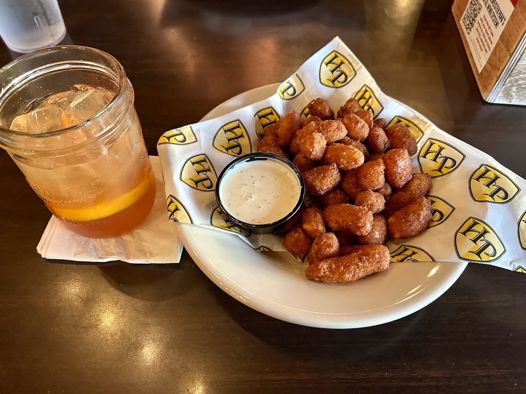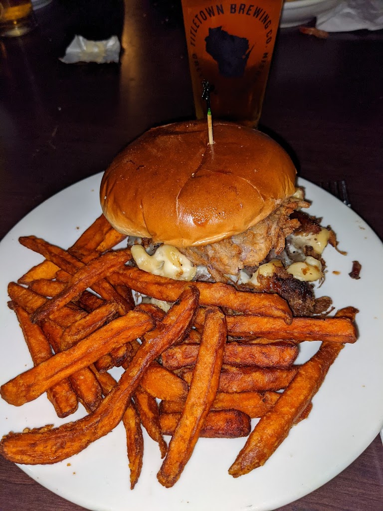 The service and atmosphere here are both amazing. The food just wasn’t great. It was average food you could get at any restaurant. Ordered the cheese curds which came and you could tell weren’t fully cooked and the pulled pork Mac burger that has haystack onion rings on it that was as hard as rocks.