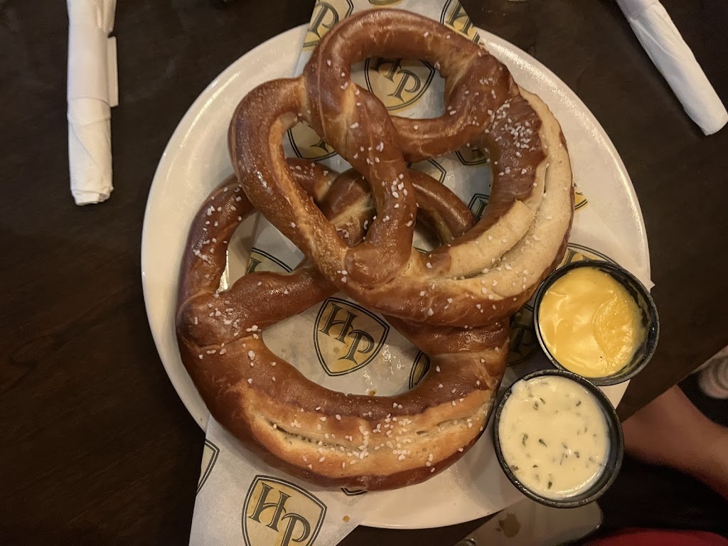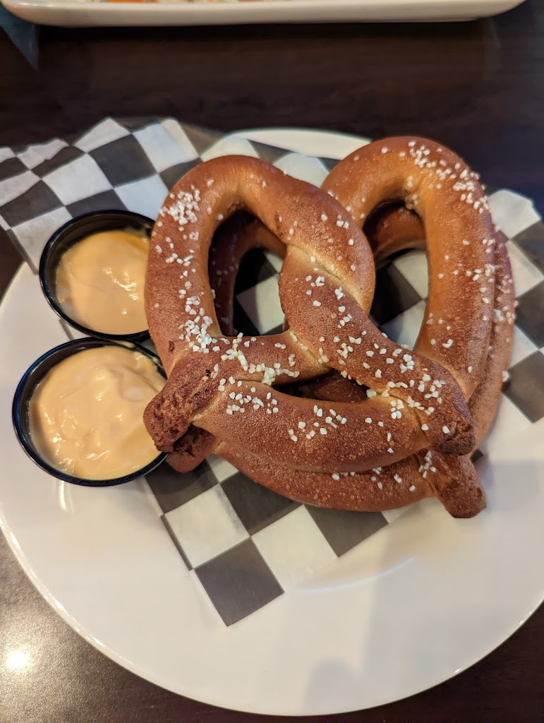 We took shelter inside the restaurant from a storm and glad we did. The pretzels were great. The beer was cold.