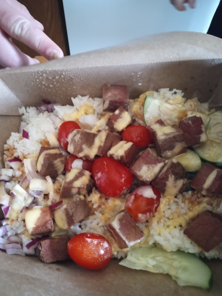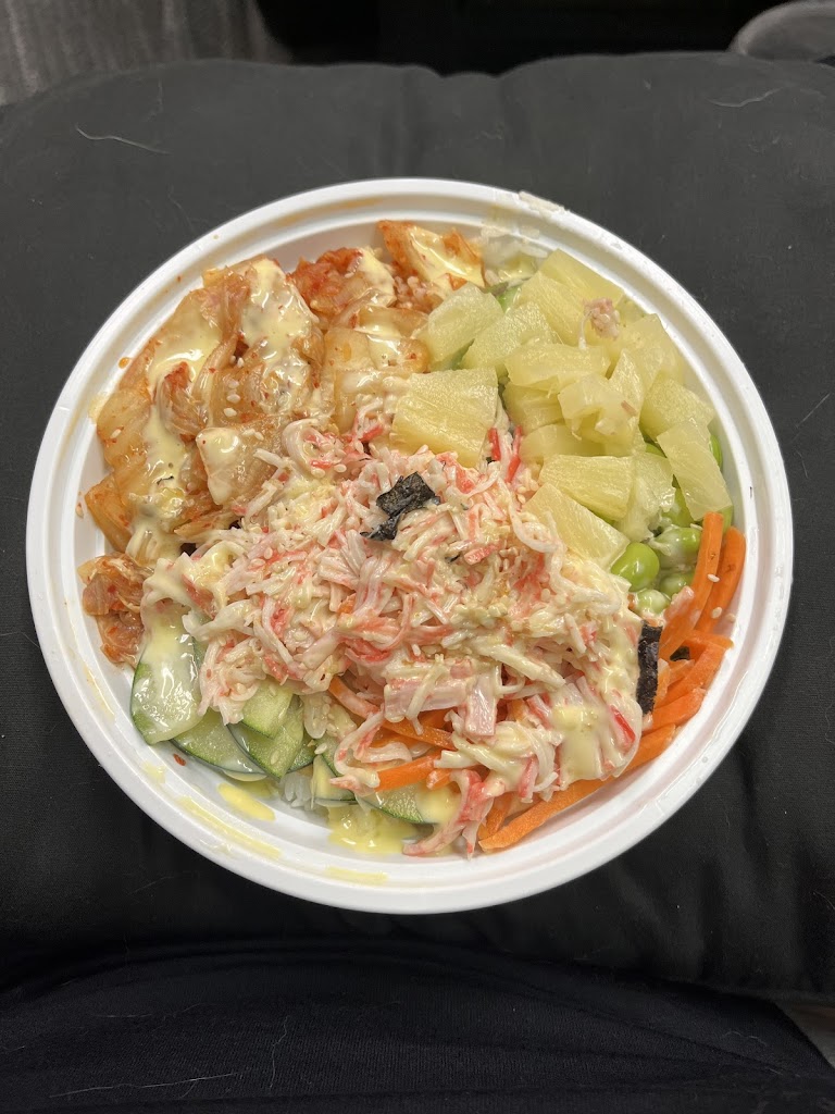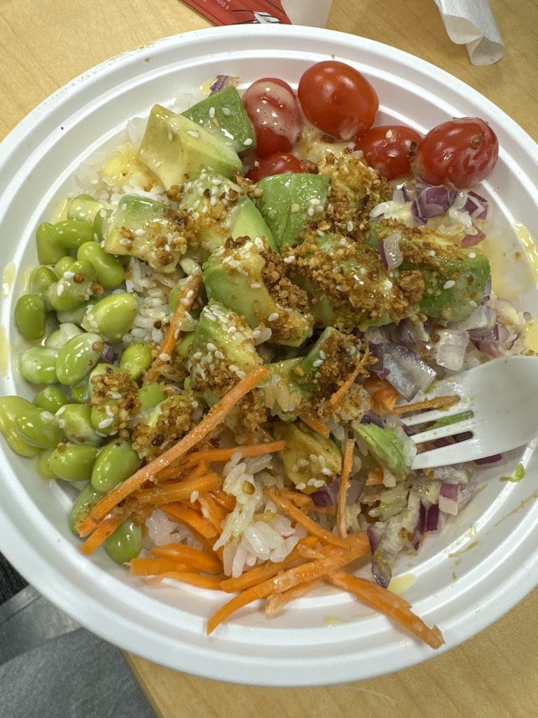 I enjoyed the flavors of the shrimp bowl—however, I was disappointed with the amount of shrimp. In a small bowl, I got about 8 small chunks of shrimps, so maybe about 3 full shrimps cut up. A lot of rice compared to veggies and shrimp. For the price, it isn’t worth it to me. It would also be nice to have brown rice instead of just white. Additionally it would be smart to have a vegetarian protein option such as tofu or imitation meat.