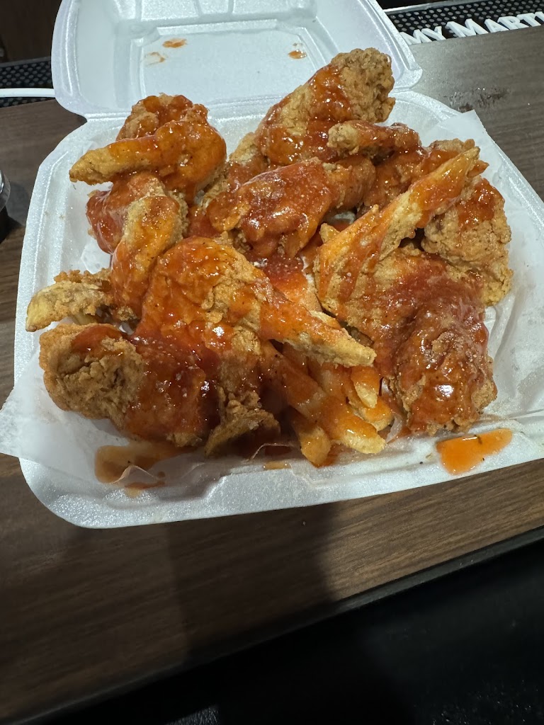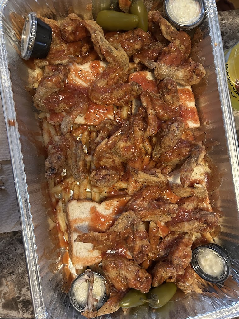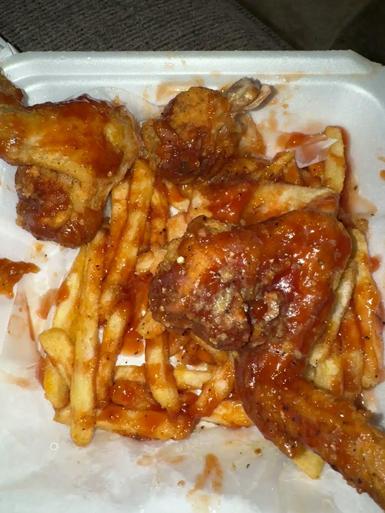 I'm from Chicago... sauce on wings and fries that's how we do it... A little taste of home, can't wait till they get the full menu, I'm missing the gizzards...