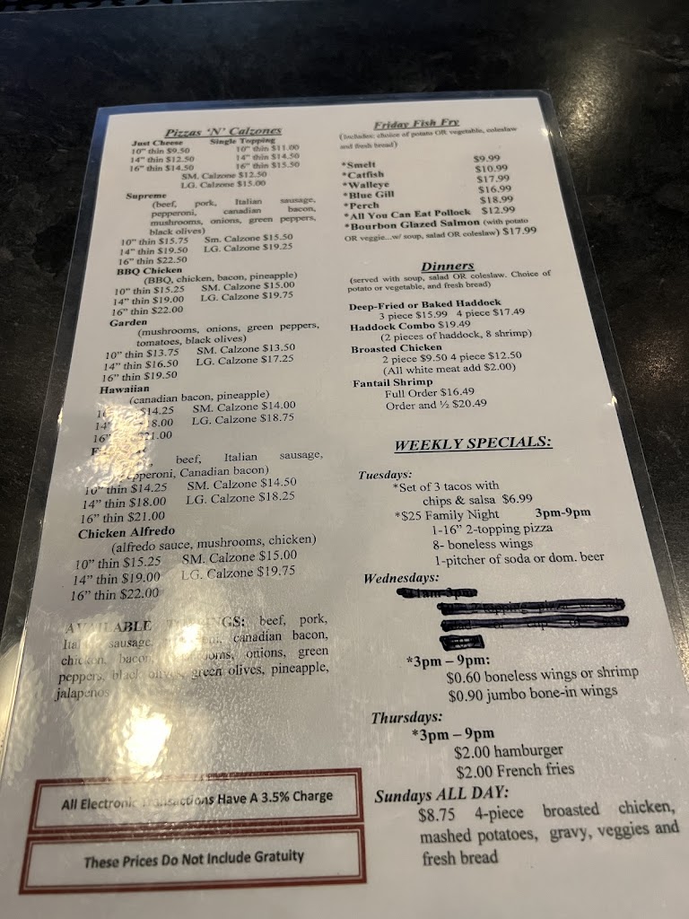 Our experience was not a great one unfortunately. I’m not usually one to review negatively but I feel like it was bad enough to warn others. We walked in and there was a couple at the bar and about 4 teenagers at a high top table that is all. Our waitress was prompt when we sat down, we ordered drinks. The drink I got had something floating in it, waitress took and got me a new one all good there. We sat for about 20 mins before she came back over to ask what we wanted to order, did not come back to ask us if we wanted more drinks since they were all about empty- sat at the end of the bar and took shots. She then brought us our food which was wings, pizza and onion rings that took over 45 mins to make. However all the food came out at once even though we order appetizers. The food was really low quality even for what we ordered. Then we asked for the check to be split down the middle and it wasn’t so then we tried doing it other payment portal and that wasn’t working. Our bill was $126 for 5 drinks, onion rings, wings and a pizza. Sorry but will not be back again.