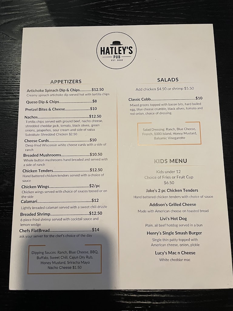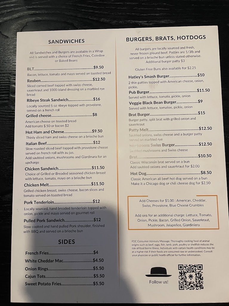 Great Menu, Service was fast, friendly, and on point. Food was beyond any other bar food I have ever had. Atmosphere was simple WI bar, but clean and fresh. Hatleys gets a 10 out of 10. FYI, the brat burger is fantastic.