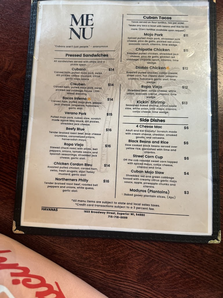 Had no idea there was a Cuban inspired restaurant in Superior. Cool vibe, very tasty food and great margaritas. While the tacos were delicious, the Cubano sandwiches were the most outstanding menu item we enjoyed. Will definitely return when visiting Superior again.