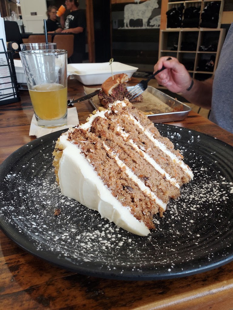 Had a blueberry lemonade drink. Delicious. Then the pork carnitas tacos. So delicious with the mustard bbq sauce. Last was carrot cake. So large took 3 days to eat.