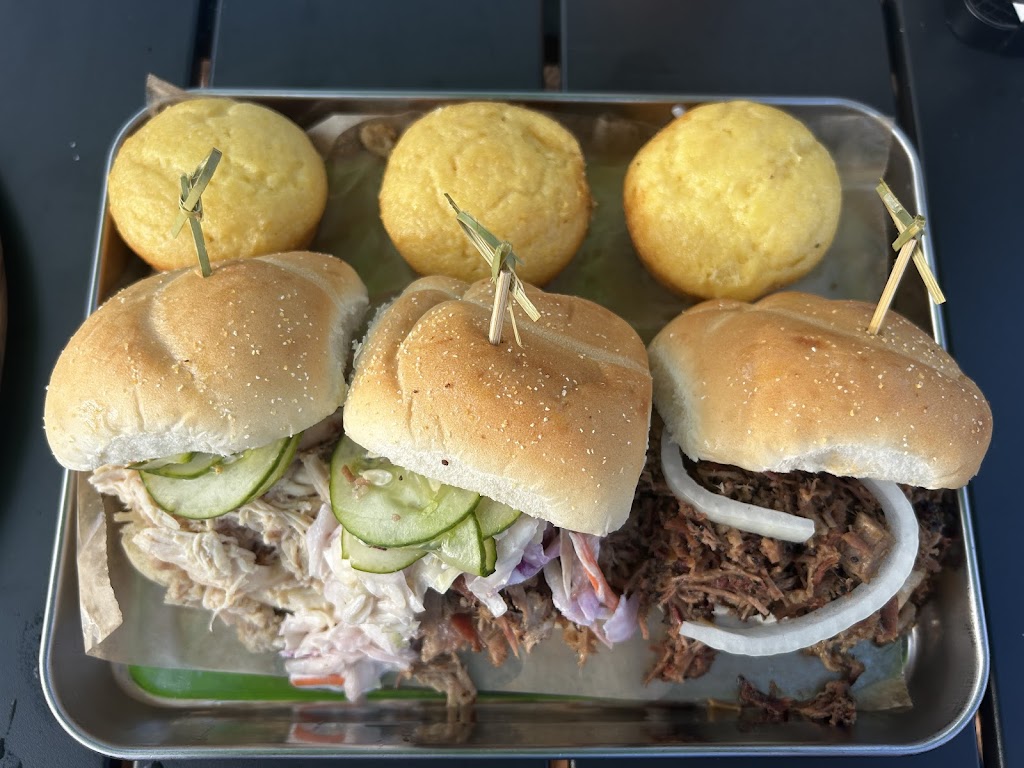 For my meal, I got the sliders trio with pulled pork, pulled chicken, and brisket with a side of cornbread. So freakin delicious.