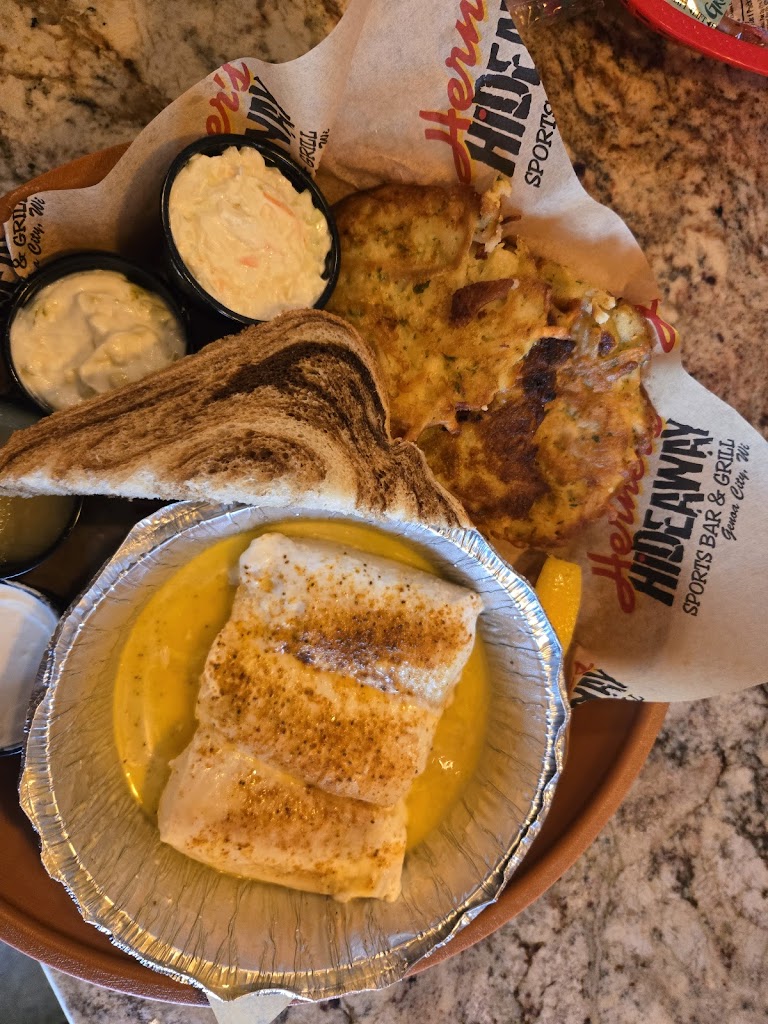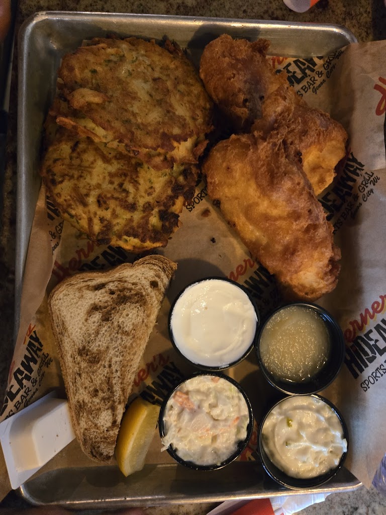 Baked fish and potato pancakes are fantastic! I am not a fan of coleslaw slaw, but I make an exception for theirs.