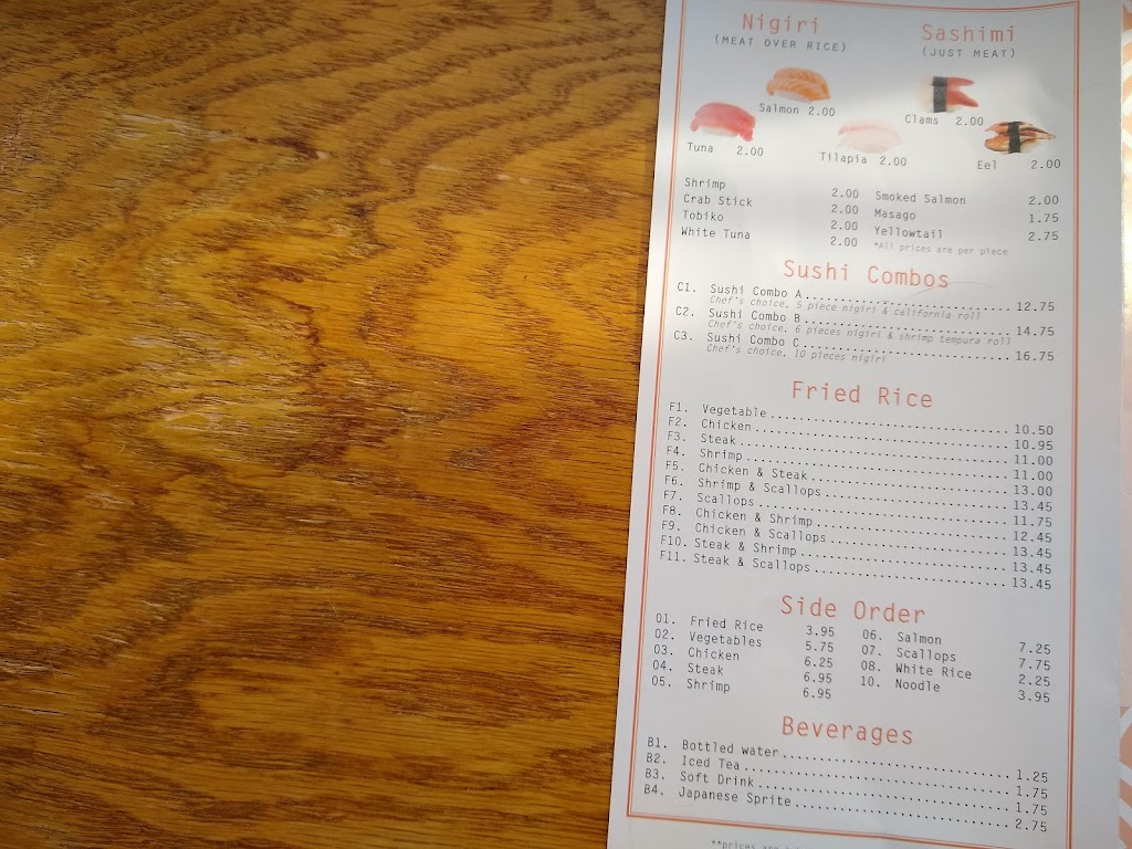 5 stars for this sushi/hibachi eat in or carry out establishment. We ate in and I choose the Chefs Choice Nigiri and California Roll (Sushi Combo 1) and the other meal was Chicken Hibachi. This place filled up quickly for seated tables at dinnertime on a Wednesday. They offer carryout (takeaway) orders via phone or in person, too.