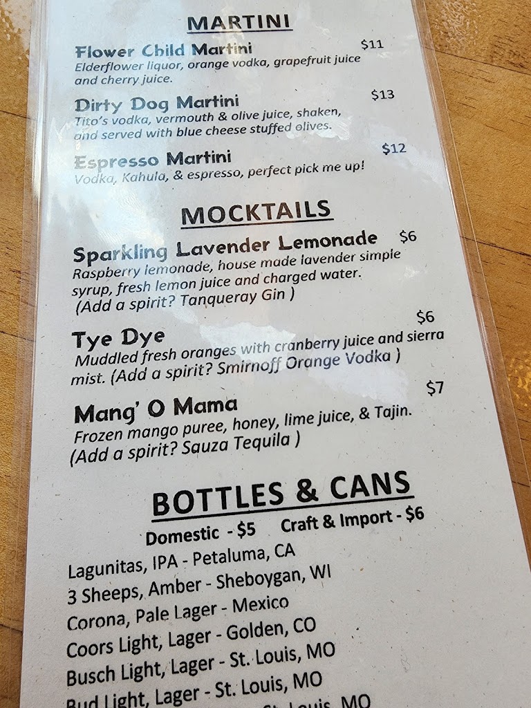 Menu: The food here is funky and different than most. I appreciate the menu's uniqueness. The dishes had a good variety of ingredients that helped balance flavors and nutrition. The menus are a couple stapled papers on everyday white printer paper. Our menus were quite worn, but they did the job. It may be time to print new ones. I and others at my table were just not expecting the menus to be in that format.