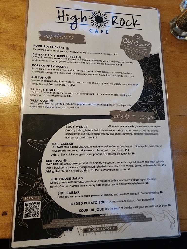 We had a great experience at High Rock Café! The food was absolutely delicious—fresh, flavorful, and beautifully presented. Our server, Dim, was fantastic—super attentive, friendly, and really made us feel welcome. He gave us a great recommendation for our meal, and it did not disappoint. Definitely a spot we’d come back to next time we’re in the Dells!