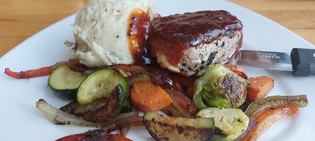 Purple drink (blackberry mojito), and food (salmon with blueberry/ blackberry couscous, pork chop with spicy peach sauce). With fresh sautéed seasonal vegetables. Did not disappoint!