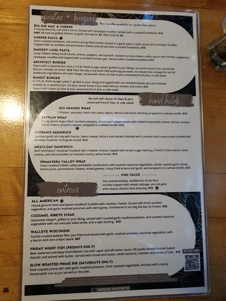 I have tried the meatloaf and big kid mac & cheese and those were both good. However, this time we tried something new. The rio grande wrap was dry and flavorless. The fish tacos weren't very good either. Atmosphere is always great at High Rock though.