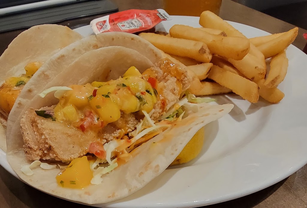 Pictures of Fried fish tacos with steak fries and a new glarus spotted cow beer