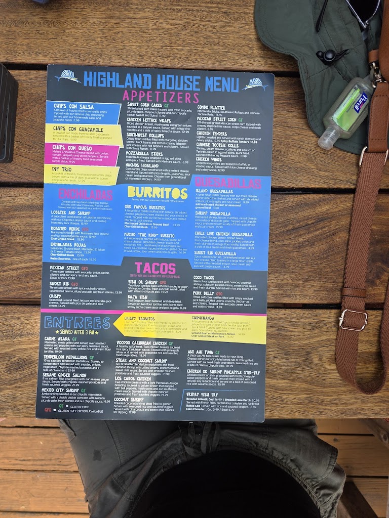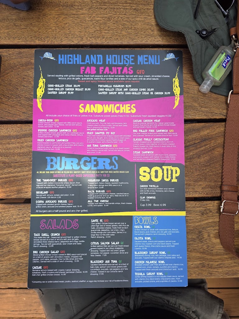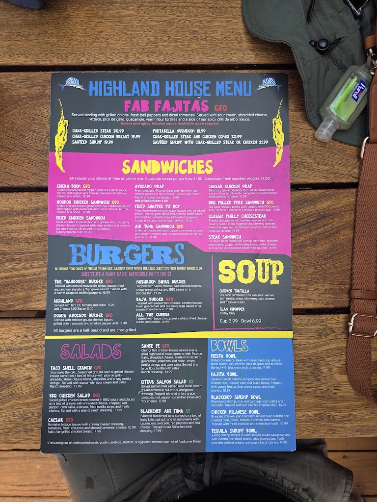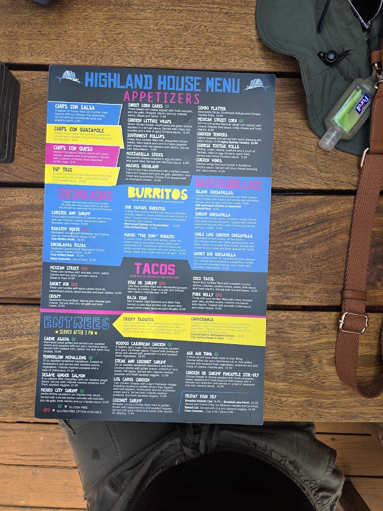 I had a really good dining experience at the Highland House. There are a lot of different food items to choose from. I got the Mahi Tuna Steak Sandwich and sweet potato fries and it was delicious. Service treated us very well and there are a lot of very cool decorations around the place