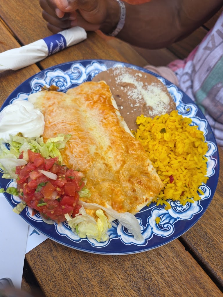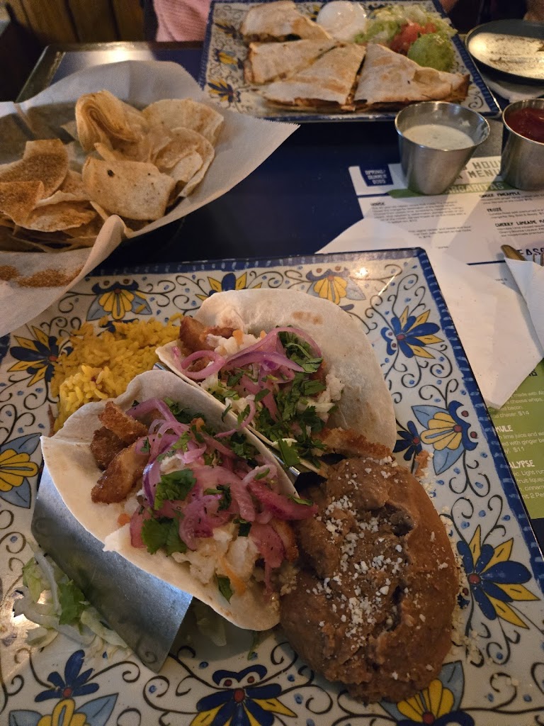 Plenty of parking. Seated immediately. A group was celebrating in a nearby room, so there's room for larger groups. I ordered chips, which came with salsa and a jalapeño ranch dip (my favorite - just a bit of a bite). The ground beef burrito was covered in queso, with a side of salsa and sour cream. I love eating rice and refried beans on chips. This was a return visit after a long absence. The service and food were excellent. And, if I wasn't driving, I would have enjoyed a margarita.