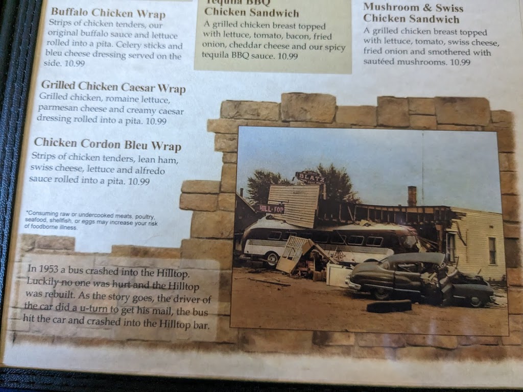 Hilltop is always a top notch WI bar and grill! More grill than bar. Service is always great. The tenderloin steak sandwich is 5 star!