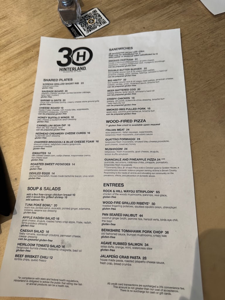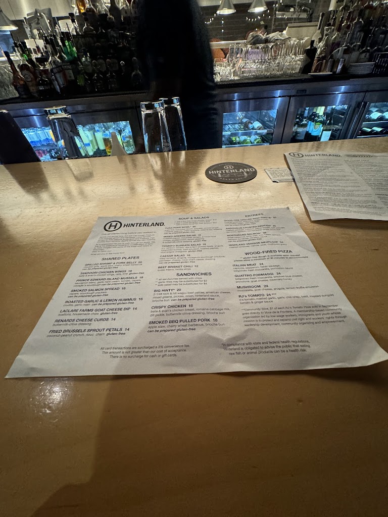 Being in the customer service business for 30+ years I have only walked out of a restaurant 3 times in my life, today being the 3rd at hinterland. Walked in and weren't acknowledged until I walked up and told the young lady we had a party of 2. We were seated promptly, but with no menus, so I asked the table next to us that was leaving if we could have there's, they politely obliged. We waited over 10 minutes, had a young man(bus boy) walk passed the table a few time, couple different servers walked passed without saying a word(no....someone will be right with you, has anyone checked on you, would you like water, etc....) we finally got up, put our sweaters on, and left still without anyone saying a word to us. Not a word on the way out the door that you usually get when you leave. Very disappointed, because my husband and I were looking were forward to trying it for the first time.