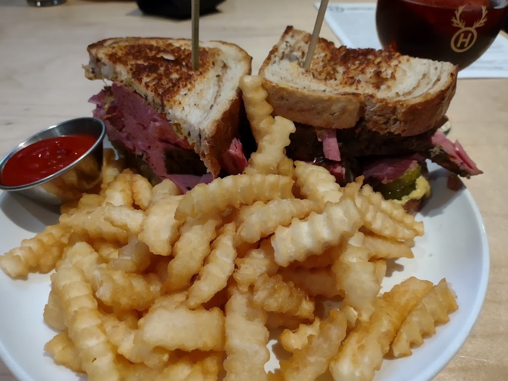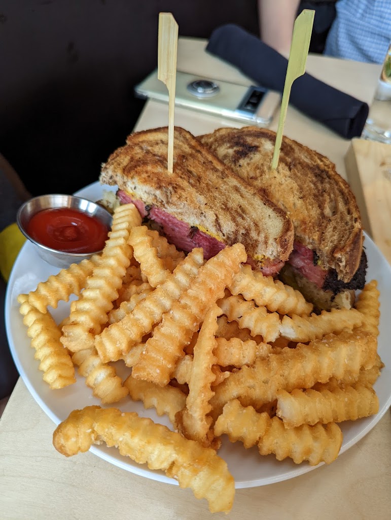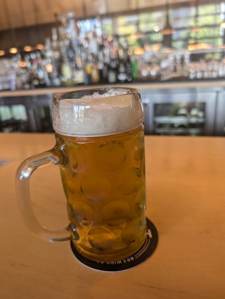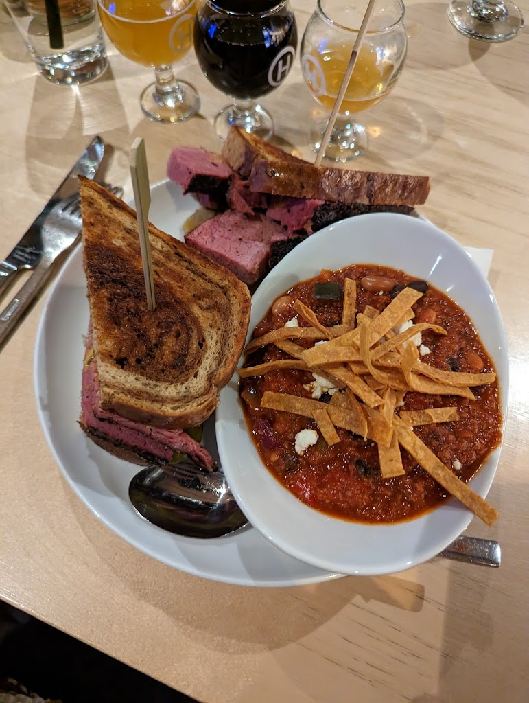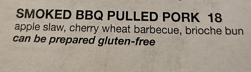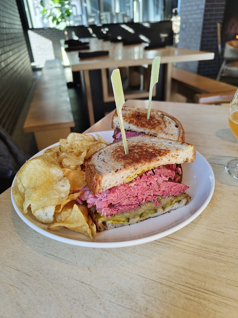 Good beer, friendly and efficient waiters but very disappointing food. The effort at gluten free cheese curds was nice, but the breading became soft and chewy almost immediately, and they were overcooked, perhaps in a failed effort to keep them crisp. The brisket chili tasted good but had only a few small pieces of brisket in the entire bowl. All beans. Most disappointing by far was the smoked pastrami sandwich. It looked great, thick (actually too thick) slices of pastrami on nicely tasted sourdough, with sauerkraut, Gruyère cheese and a horseradish sauce. Sounds great, but had no flavor! The meat seemed to be boiled - completely bland with tiny hint of smoke flavor, but no taste of pastrami at all. It also had unappetizing streaks of brown in the meat, definitely NOT from smoking as it was in the middle. There was very little sauerkraut and it too was so mild you couldn’t taste it. And there was NO flavor of horseradish at all! I asked for some mustard to give it a little flavor. Really bad for a $24 dollar sandwich.