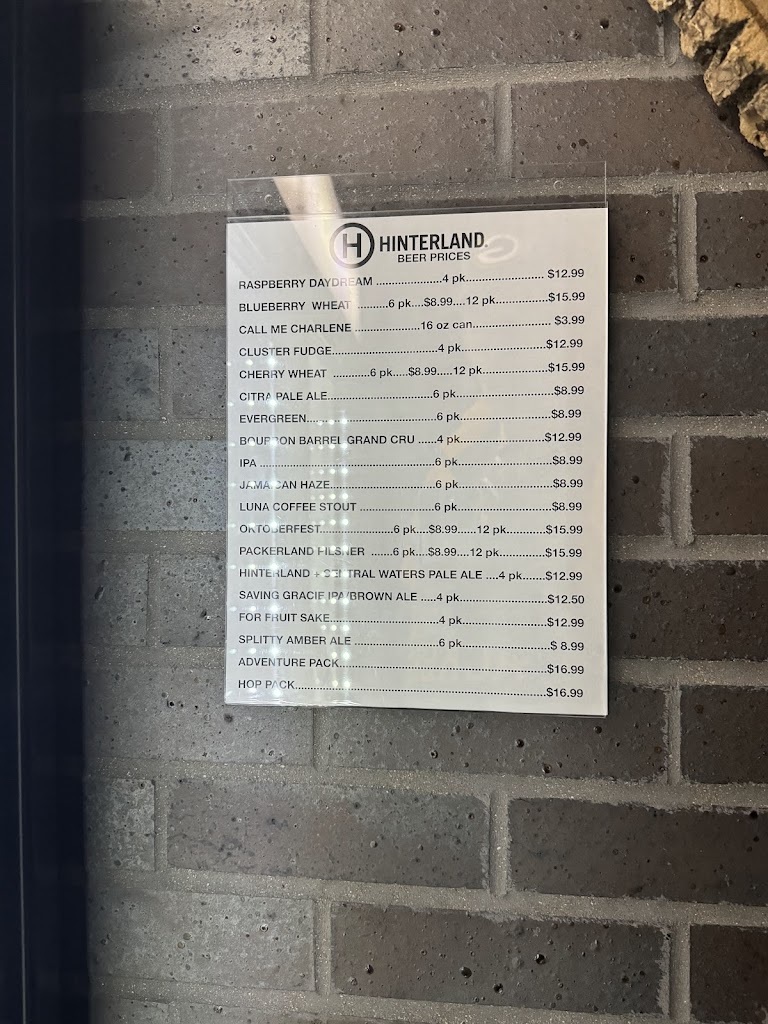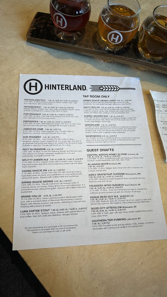 Excellent variety of beers, delicious food( especially the Brussels) and fast friendly service and so close to Lambeau makes a visit to Hinterland a must when visiting Green Bay.
