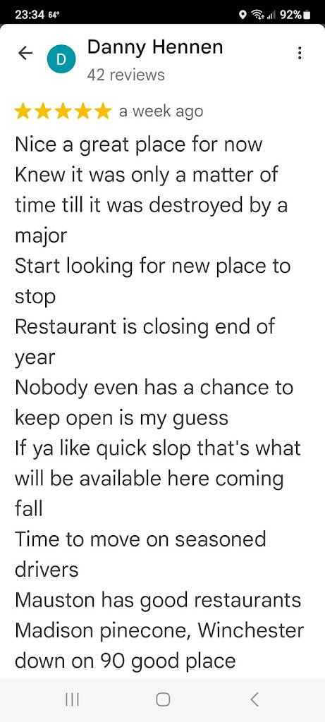 Words cannot say enough about this place!!! The food is awesome! The people oh my goodness gives you faith in true kindness in the world!! We got stranded on the start of our family vacation by hitting a deer. We cannot express the kindness we found at this plaza!!! The people are beyond amazing!! Even an anonymous trucker left us a much needed helpful gift!! Bless him!! Please if you are driving by stop in you will not be disappointed!!!!!