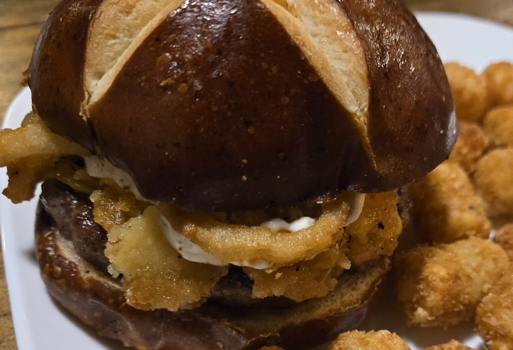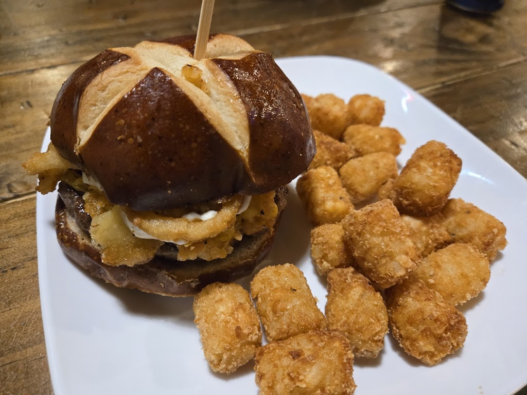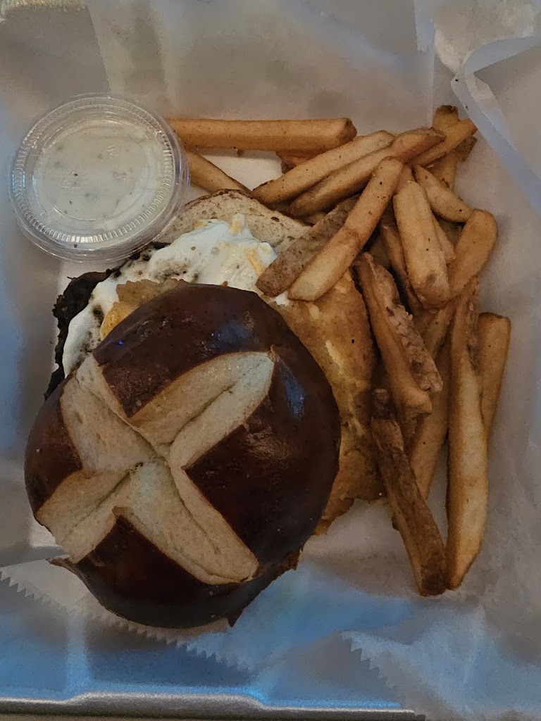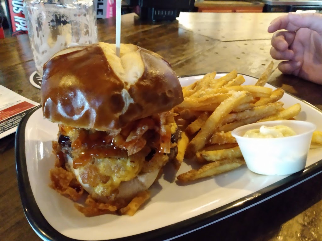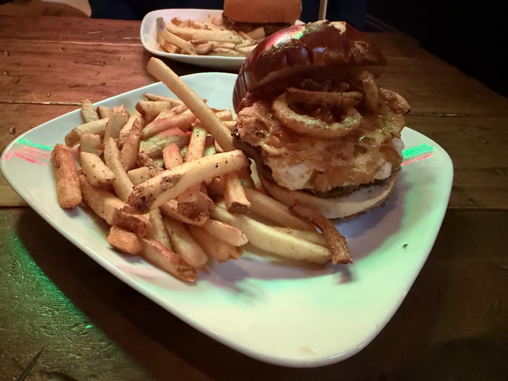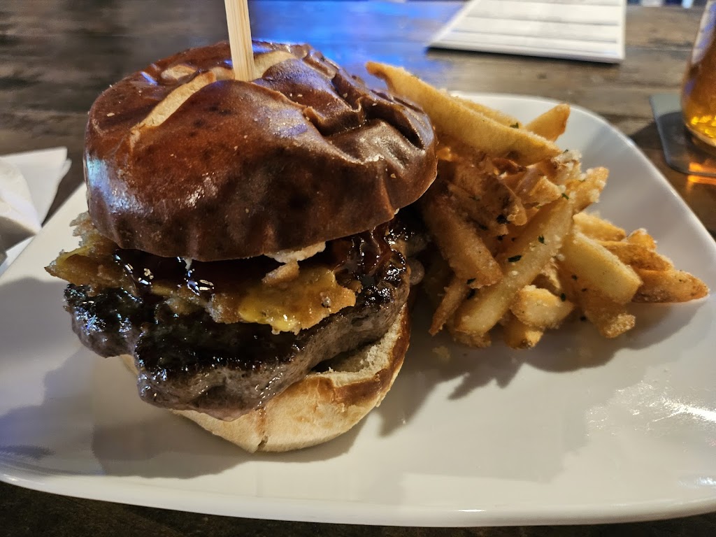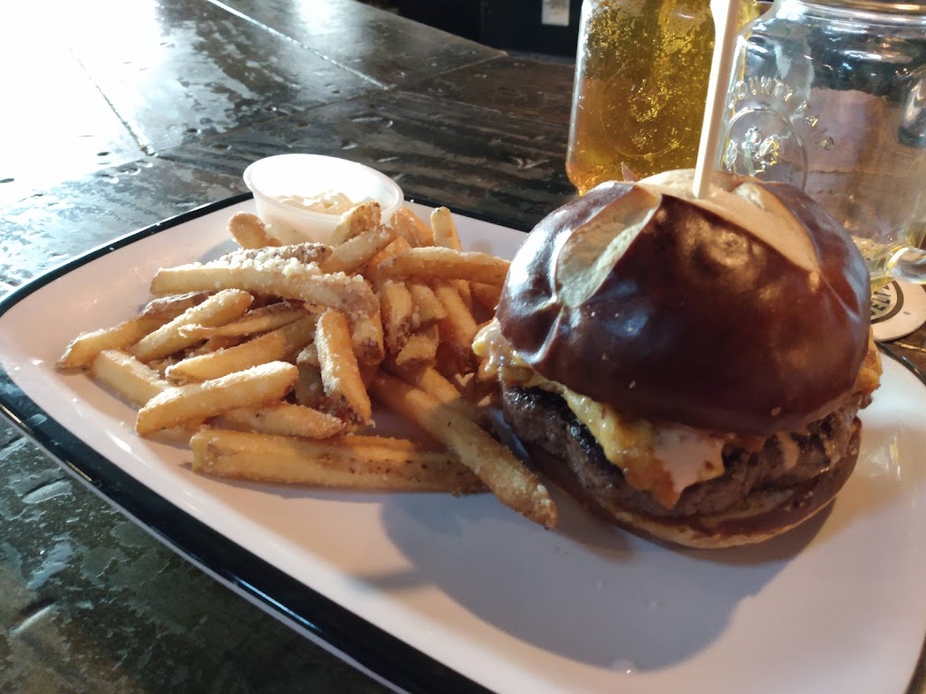 I ordered the Beer Dip Badger burger; smashed fried cheese curds, homemade spotted cow beer dip, crispy onion strips, and a pretzel bun. The toppings I received were minimal; three very small onion strips, a few smashed cheese curds, and a sauce that tasted like store-bought thousand island dressings. I was unimpressed.