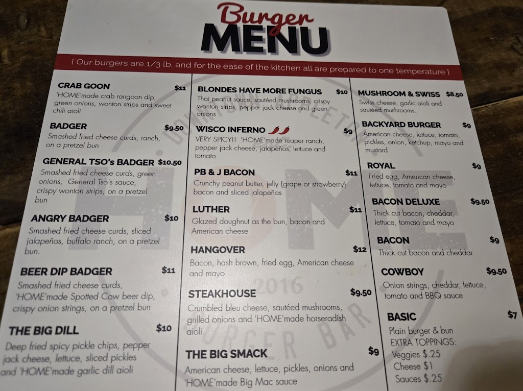 Home Burger is a nice bar and grill with delicious food and beer options. The Yunegling burger was a delicious and unique option to Wisconsinites.