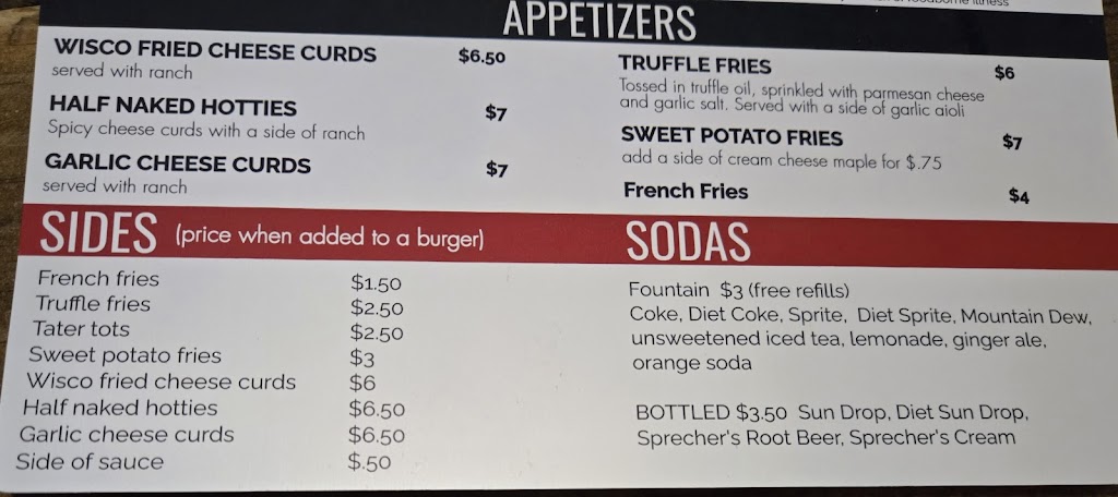 Both my friend and I stopped here for lunch because we had heard good things about their burgers. Unfortunately, both of us were very disappointed. The menu claims that the burgers are 1/3 pound, but they are maybe 1/4 at best; I would compare them more to smash patties. Both of us ordered medium burgers and they both came out well done. The burgers were low-quality frozen patties; unseasoned and flavorless. Most other places that serve good burgers in Appleton use fresh hamburgers. Apparently, this place can't be bothered, they can't afford it, or they simply don't care. Our other biggest complaint would be that they don't include a side with their burgers; fries are not very expensive and, at the very least, they should be an included side. The owner, a very mean and disrespectful woman, said most of their customers don't want a side, so they don't include a side because they don't want to waste food. How exactly are they wasting food if they include a side for those who want a side and withhold a side for those who don't? At least include fries as a side option for those who want them; nothing is wasted. Her reasoning for not including a side makes absolutely no sense. let's be honest, they don't include a side because they want to charge you more money. $11 for a frozen burger with no side is ridiculous.