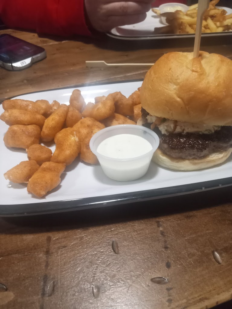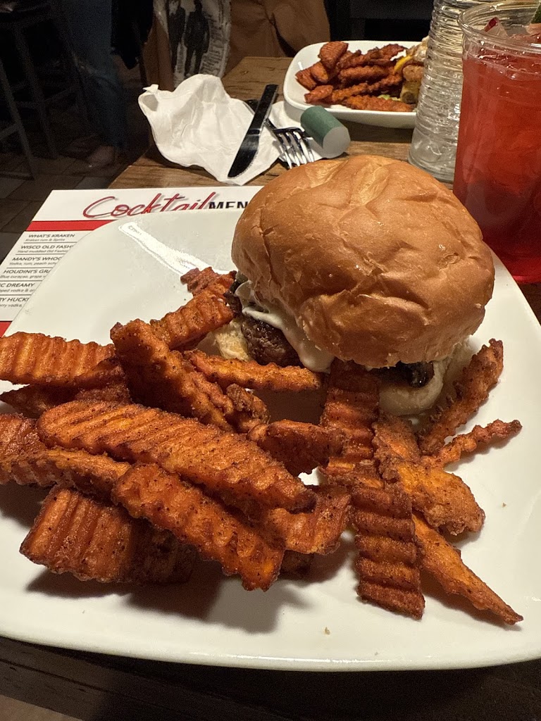 First time here and we went with the bartender/waitress's first choice of burger which was the Crab Rangoon burger. I chose the spicy cheese curds and he chose the Truffle Fries for our sides. We loved that they carried Angry Orchard and I was able to try strawberry gin for the first time!! Signature cocktail Gin & Juice (strawberry Gin with lemonade) it was sooo good! 🤤 Atmosphere is great as a bar...as a "restaurant" it's not as secluded. You are right in the open at tables surrounding the bar. Which didn't really bother us...but we are booth type ppl usually lol. We will definitely go back to try a different burger and next time will be a big order of the truffle fries...those were THE BEST fries EVER!
