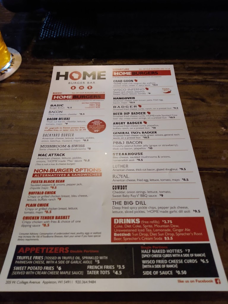 The atmosphere of Home is very Midwestern bar, in a bigger city I could see this place being considered "divey," but it was definitely clean, had an appropriate beer list for pairing, and a decent selection of liquor and cocktails. We like to explore, but I have a feeling we'll be back when we decide to chill in Appleton in the future.