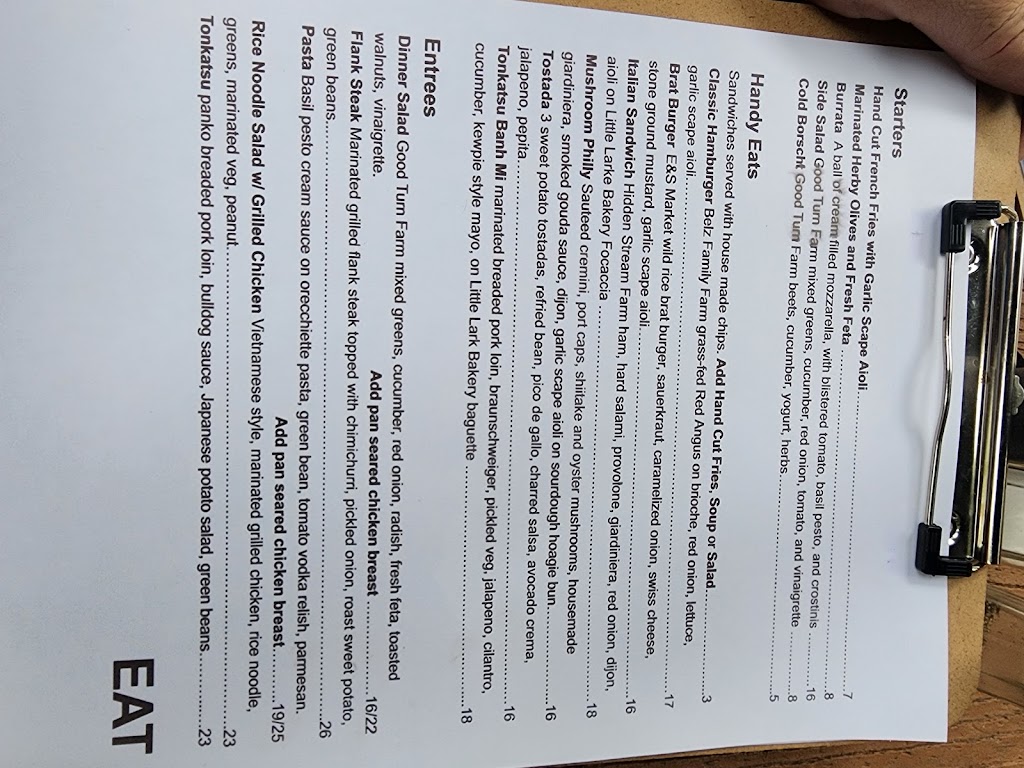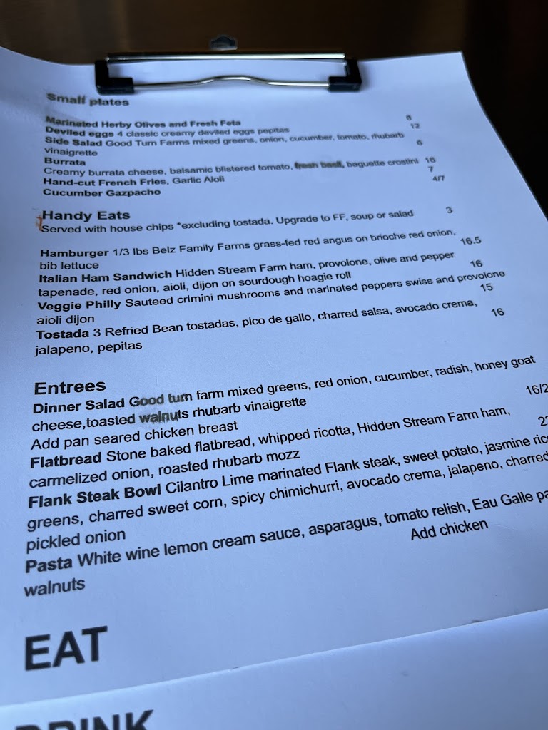 The menu is delivered on a clipboard with the offerings for the day. I included it in the photos. I enjoyed the Creamy Squash Sage Pasta. Which was absolutely amazing. My dining companion had the Mushroom Philly Sandwich with fries and the Marinated Herby and Fresh Feta as a starter. Since it was her birthday she topped it off with a Flourless Chocolate Torte w/ Spicy Orange Cardomom Bourbon Syrup. I enjoyed their Cheesecake w/ Apple Cider Caramel sauce. They were to die for. Absolutely delicious!