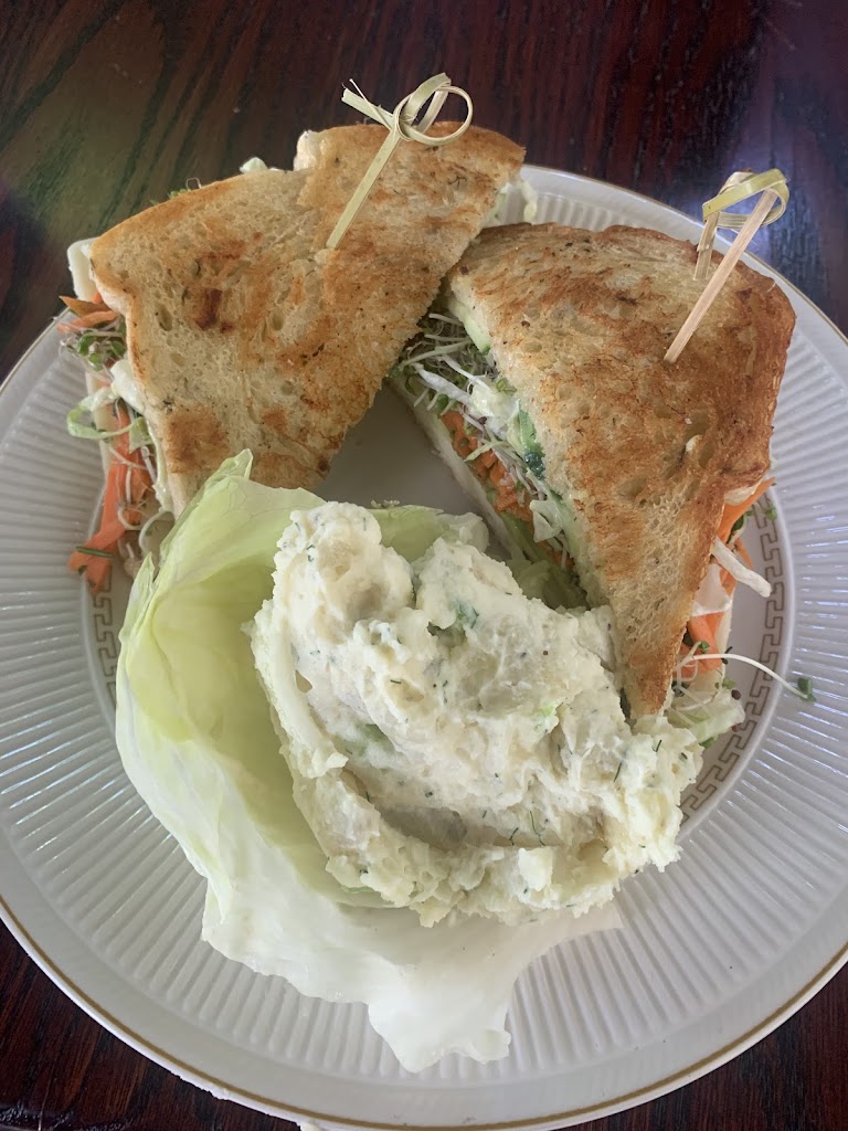 However, once we sat down and had a chance to look at the menu he seemed to be in a better mood. And the food was PHENOMENAL. An interesting selection of sandwiches and other items that, if I had the time and money, I would have tried everything. The fryer was off that day due to the heat, which limited some of our options, but that was okay. I ended up getting a veggie sandwich, which was good, but the highlight was by far the potato salad, which was served in this adorable lettuce wrap (see photo). Cute and very tasty.