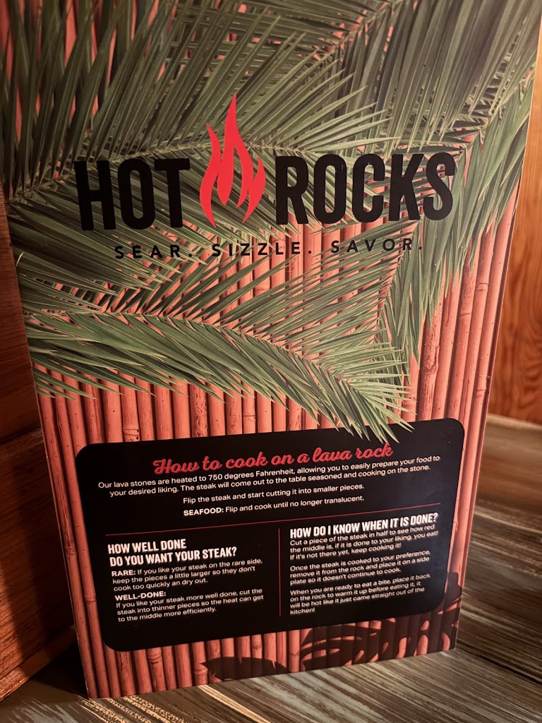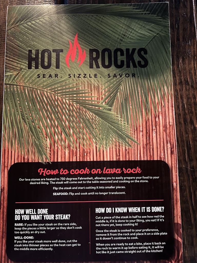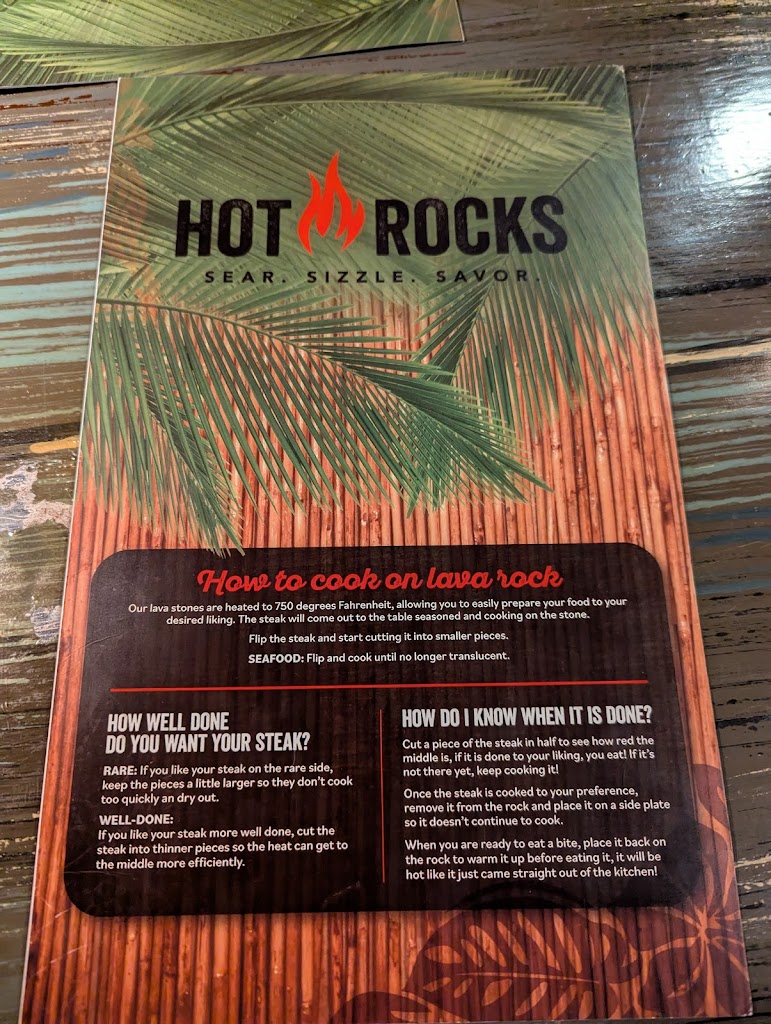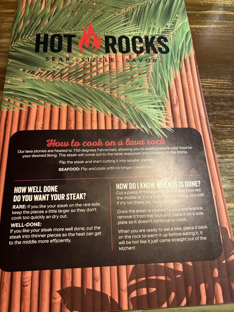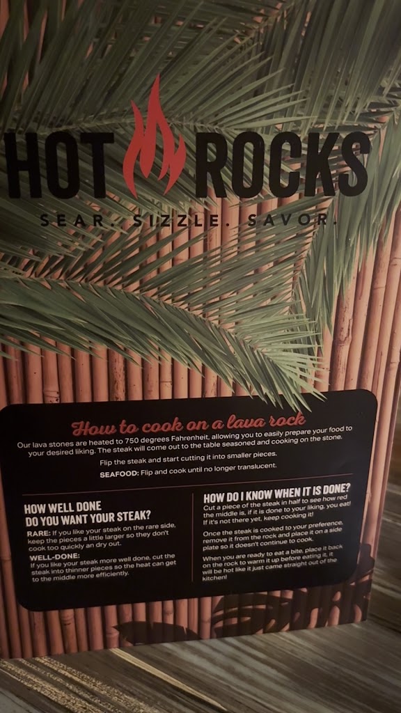 Hot Rocks was an amazing experience. We had a very attentive, informative waiter named Walter. The best way I can describe the experience was like a personalized, tabletop cookout. The food was fresh and flavorful. The vegetables were just right. The lighting in the restaurant was also just right. The decorative lamps and additions to the top of each table gave island vibes. We enjoyed the experience from beginning to end!